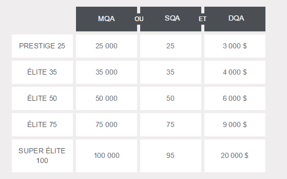 Comme vous pouvez le voir dans le tableau ci-dessous, pour atteindre le premier palier « Prestige 25 », il faudra non seulement avoir parcouru 25 000 miles (MQA) OU avoir effectué 25 segments (SQA) mais en plus avoir dépensé au moins 3 000$.