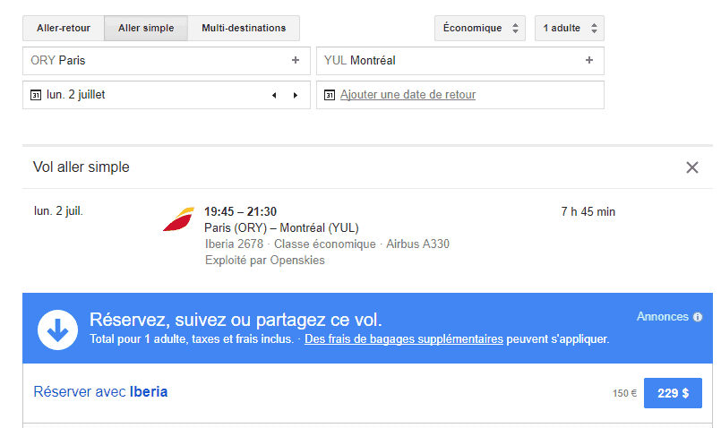 La réservation finale s’effectuera sur le site de la compagnie espagnole Iberia (membre d’IAG, l’organisation regroupant entre autre Iberia, British Airways et la compagnie à bas coûts LEVEL).