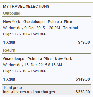 Ensuite, un vol New-York (JFK) – Pointe-à-Pitre sur Norwegian pour 228 US$ aller-retour du 9 au 16 décembre.