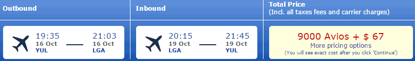 J’ai trouvé avec mes miles avios (British Airways Executive Club) un vol Montréal – New-York (La Guardia) du 9 au 16 décembre pour 9 000 avios et 67$.