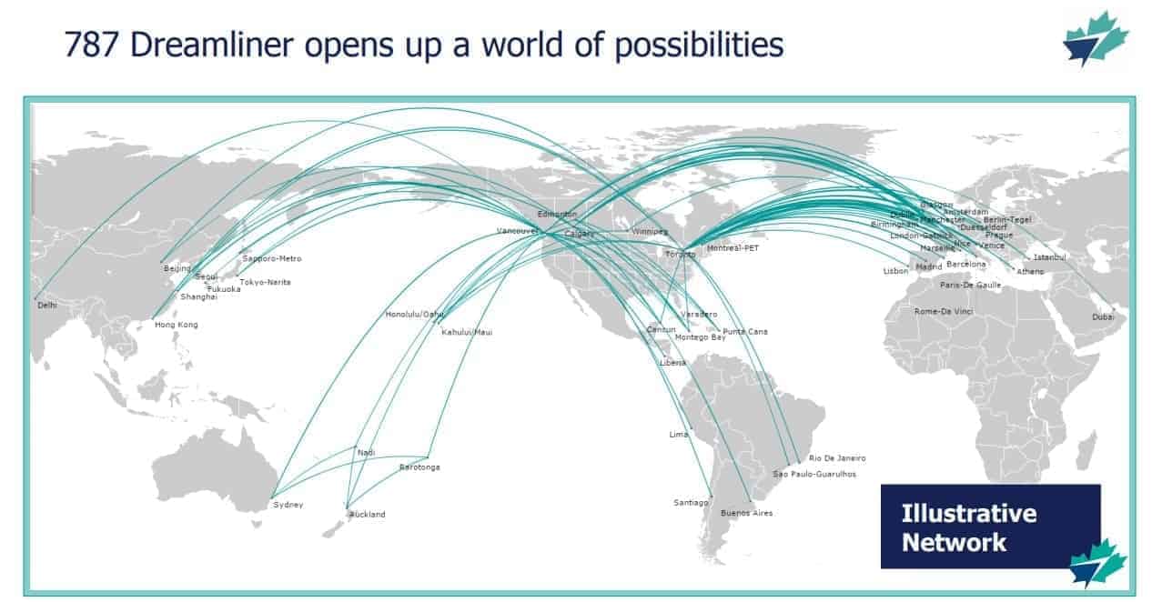 D’un autre côté, cela permet à WesJet de venir un peu plus « jouer dans la cour des grands », surtout dans le cadre de son projet d’expansion à l’international avec tous ses B 787 Dreamliner en commande. Voilà les prochaines routes que WestJet a en tête….ou tout du moins l’éventail de « possibilités » que lui offrent ses futurs B787 !