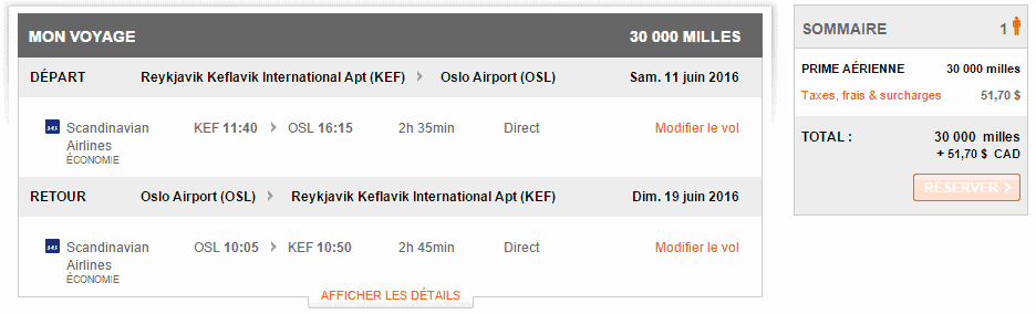 Aéroplan vous permet de réserver des primes sur les compagnies Star Alliance. Depuis l’Islande, seule Oslo est pour le moment disponible via la compagnie SAS Scandinavian.