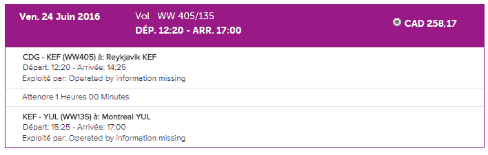 L’aller est bien là aussi au prix plancher de 149$ alors que le prix le moins élevé pour le retour est de 258$. Pour un total imbattable de 407$. Mais vous faites une correspondance en Islande qui est toutefois courte (entre 1 et 2h).