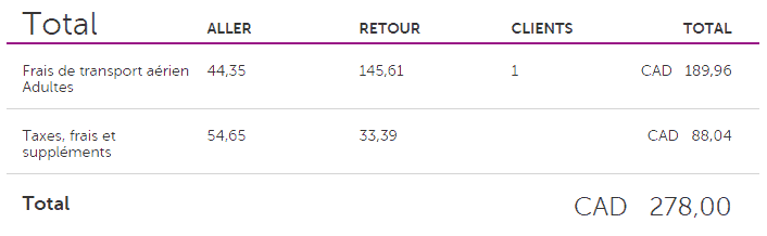 Comme vous pouvez le voir, l’aller est bien à 99$. Le retour coûte cependant plus cher à 179$ (et c’est le plus bas prix affiché).