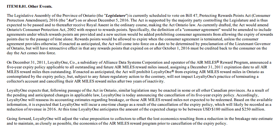 Going forward, LoyaltyOne will adjust the value proposition to collectors to offset the lost economics resulting from a reduction in the breakage rate estimate and to maintain, as closely as possible, the economics of the AIR MILES reward program prior to cancellation of the expiry policy.