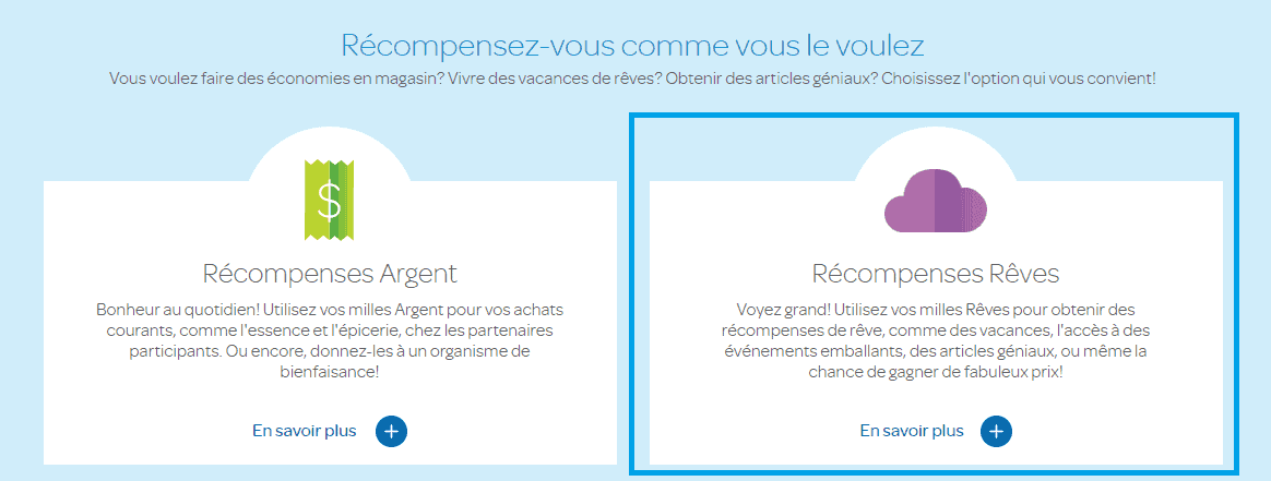 AIR MILES explique que les produits disponibles dans la catégorie Rêves sous la forme de « miles + complément monétaire avec une carte de crédit » sont très populaires auprès des adhérents.