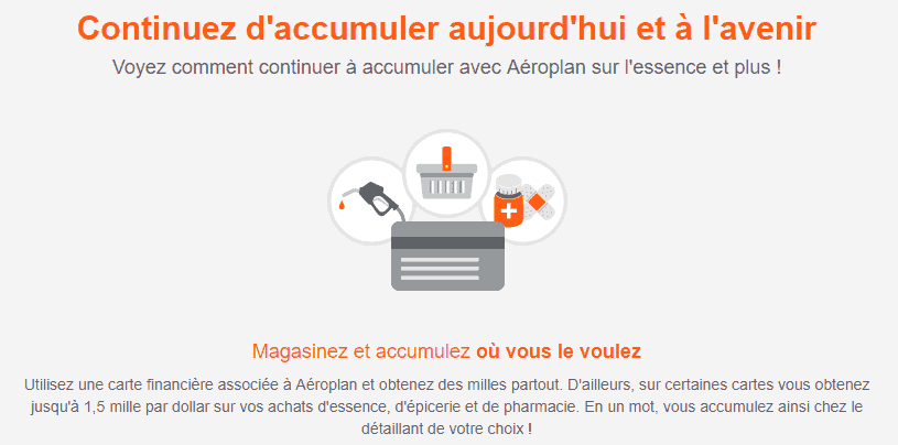 Aéroplan essaie d’inciter ses membres à utiliser une carte de crédit affiliée au programme (TD, CIBC, American Express) pour continuer à accumuler des miles Aéroplan sur les achats d’essence, de pharmacie ou de tous les jours…