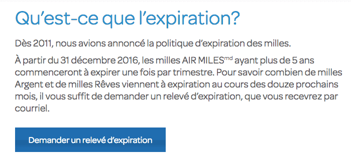 Depuis 2011, les milles du programme de récompenses AIR MILES ont une durée de vie. Ils expirent après 5 ans que votre compte soit actif ou non!