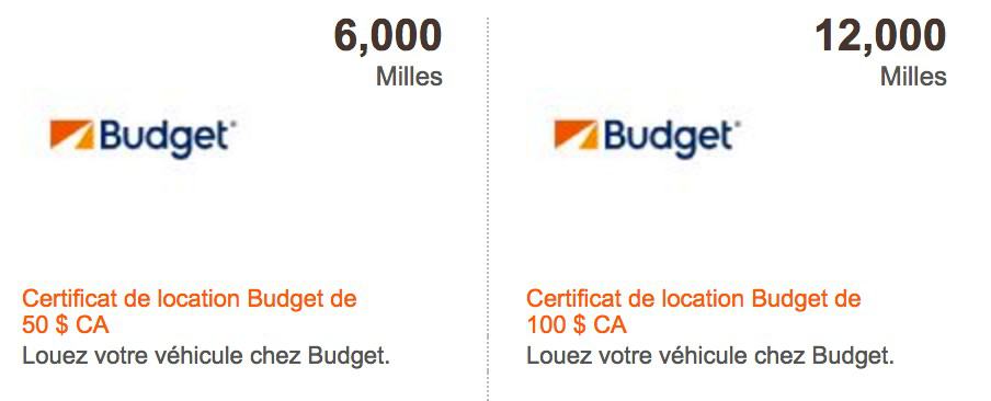 Il est possible d’acheter des cartes-cadeaux Budget de 50 $ (6000 miles aéroplan) et 100 $ (12 000 miles aéroplan) sur le portail de récompenses Aéroplan.