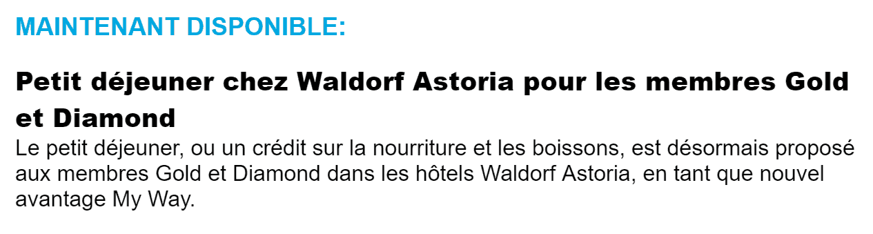 Les membres ayant le statut Gold du programme Hilton Honors auront désormais le droit, gratuitement, aux petits-déjeuners dans les hôtels de la marque Waldorf Astoria.