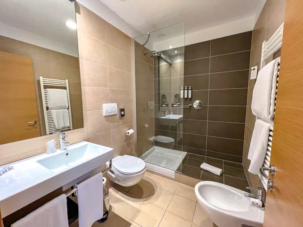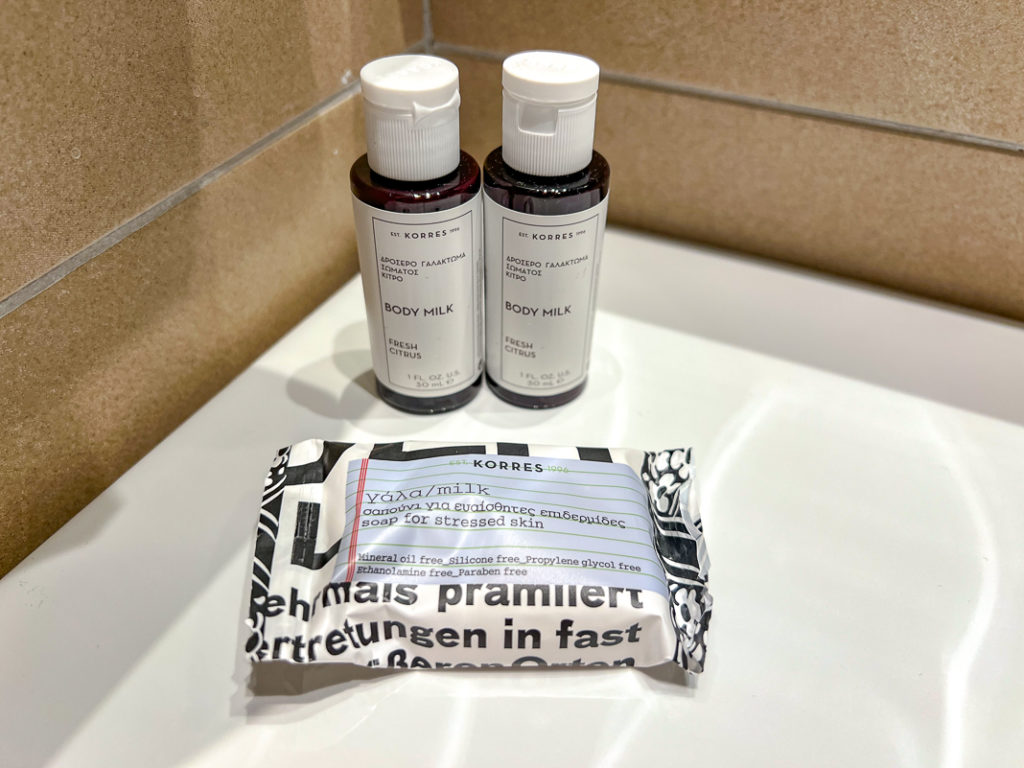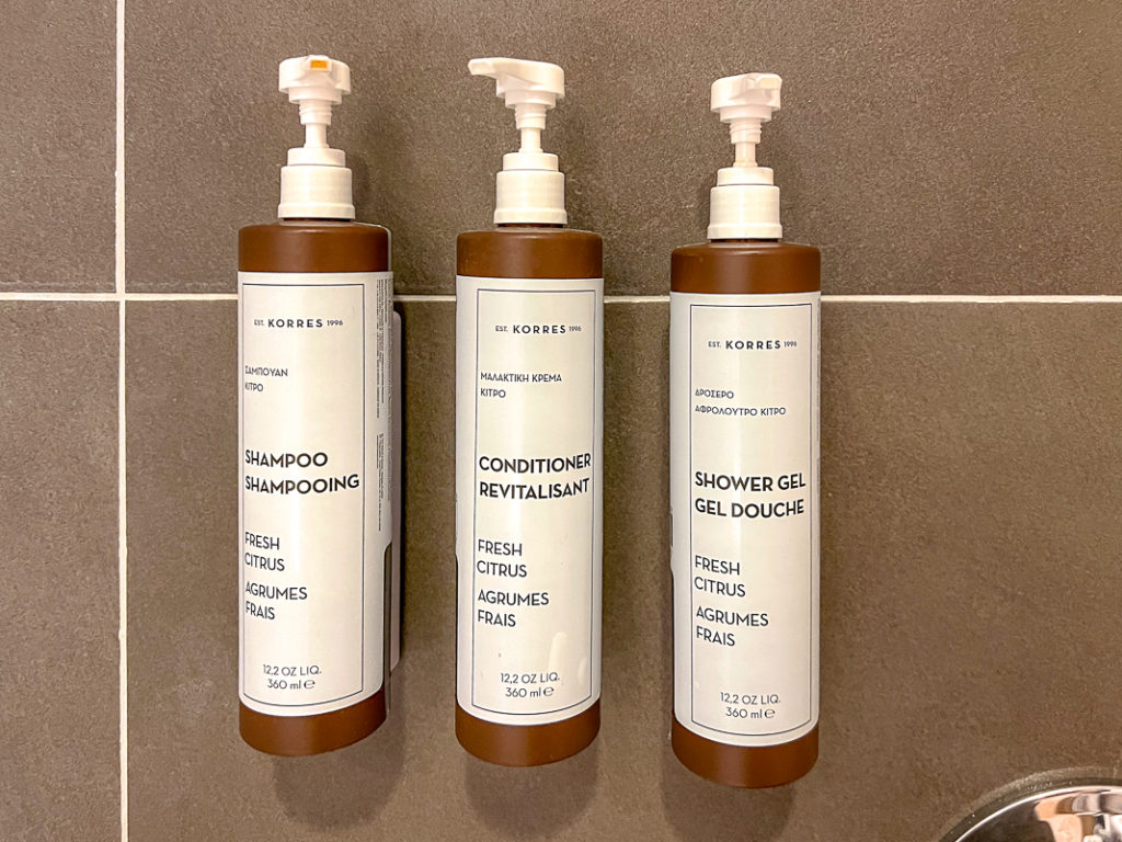 La salle de bain était spacieuse et munie d’une douche à effet de pluie, d’un bidet et de produits d’hygiène de la marque Korres.