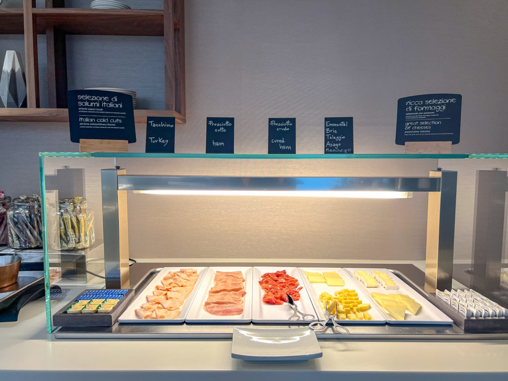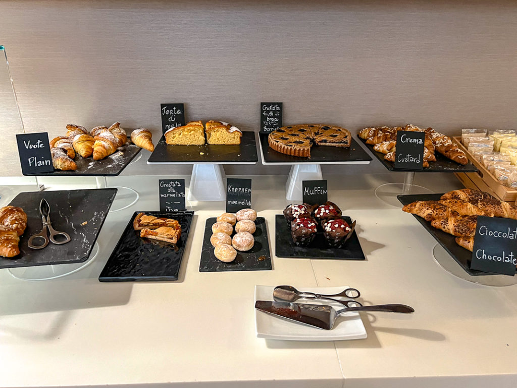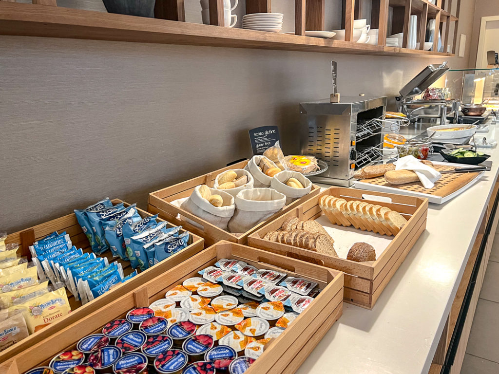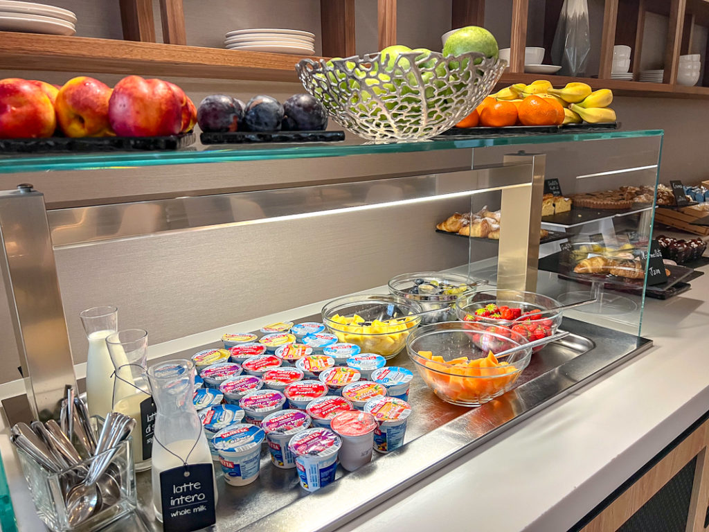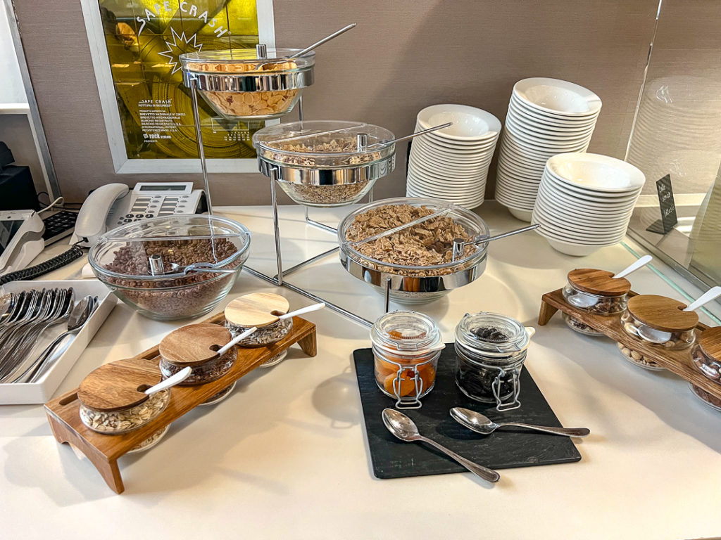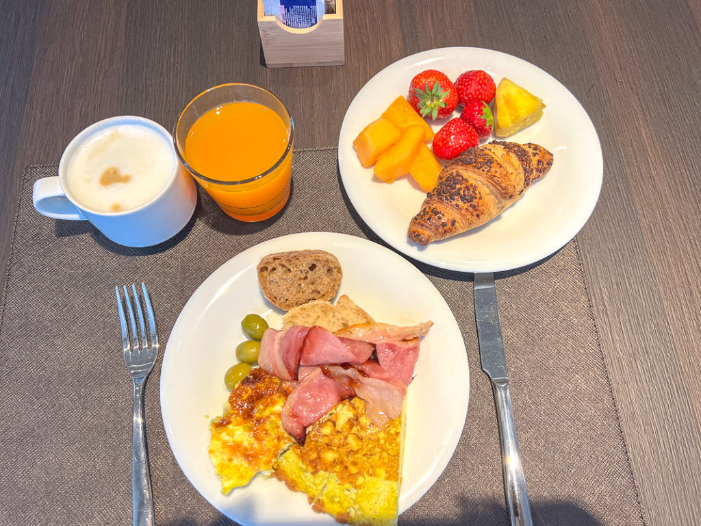 Le petit-déjeuner était très complet avec un buffet chaud et froid, une variété de viennoiseries, de charcuteries et de fromages en plus d’un bar à céréales et une bonne sélection de fruits et de jus de fruits. J’ai aussi remarqué qu’il y avait des options de pain sans gluten et plusieurs sortes de lait (à base végétale également).
