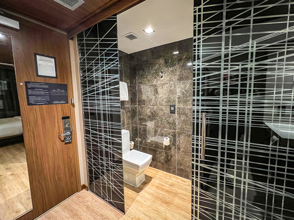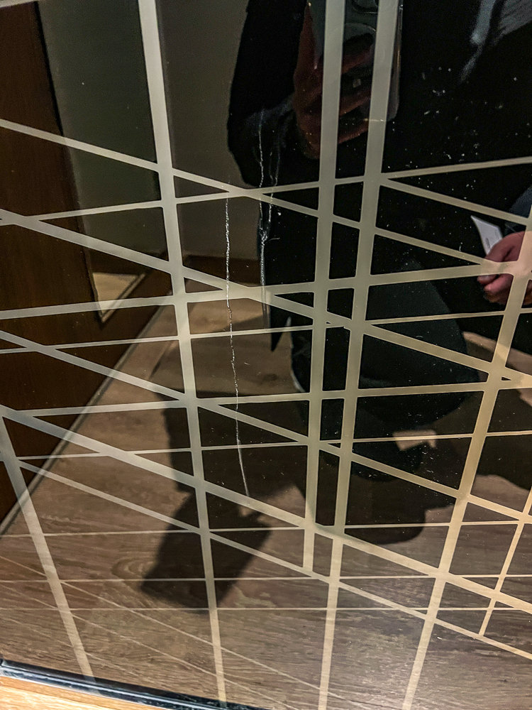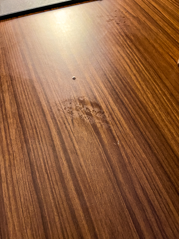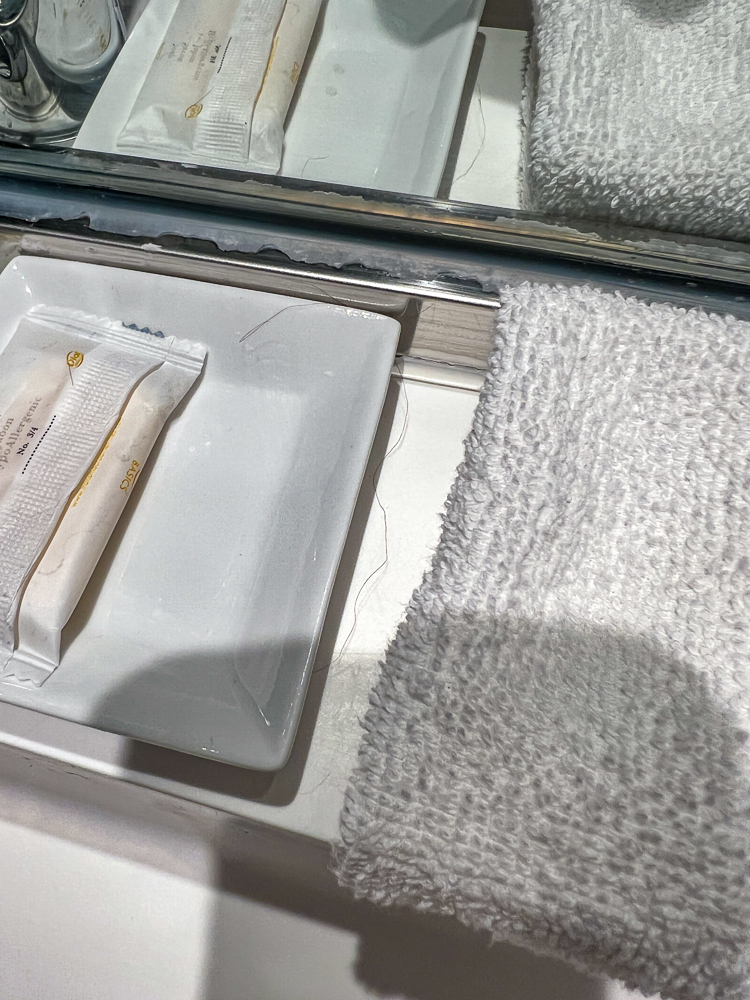 En effet, une fois arrivé dans notre première chambre, le bureau et la porte vitrée de la douche étaient sales, de nombreuses tâches de graisse laissant penser que les surfaces n’avaient pas été nettoyées correctement selon le protocole de nettoyage de Marriott.