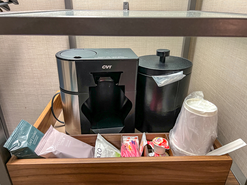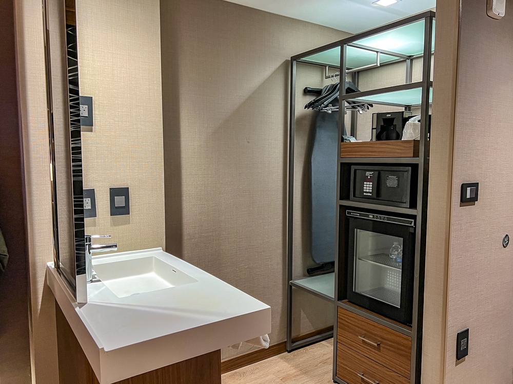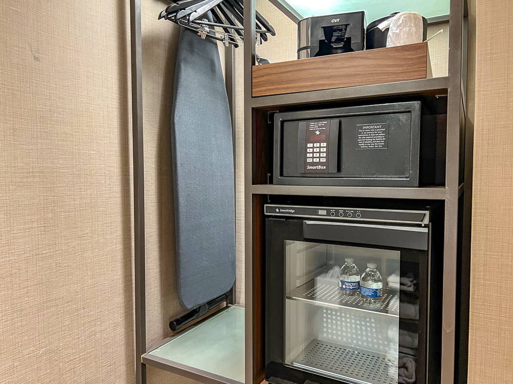 Celles-ci comportaient le nécessaire pour le café et le thé, ainsi qu’un réfrigérateur avec deux mini-bouteilles d’eau. Un coffre de sûreté et une table de repassage étaient également disponibles.