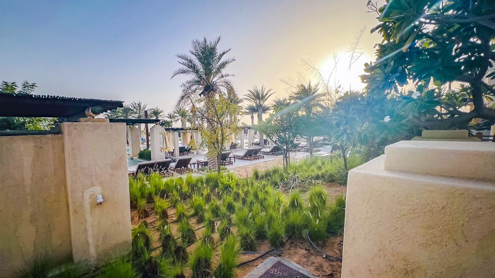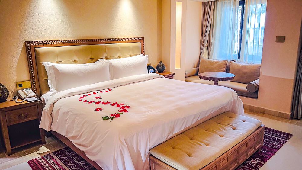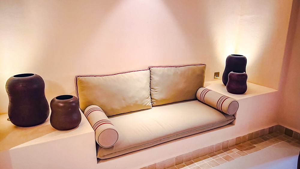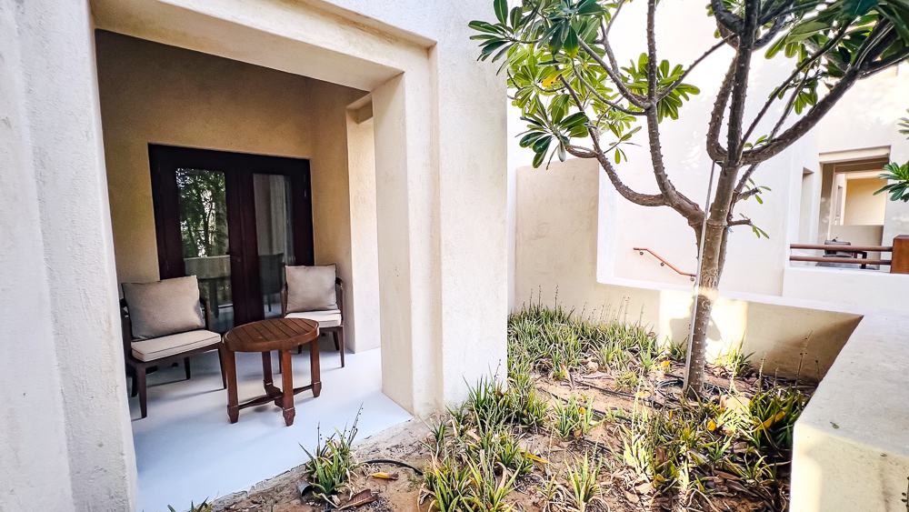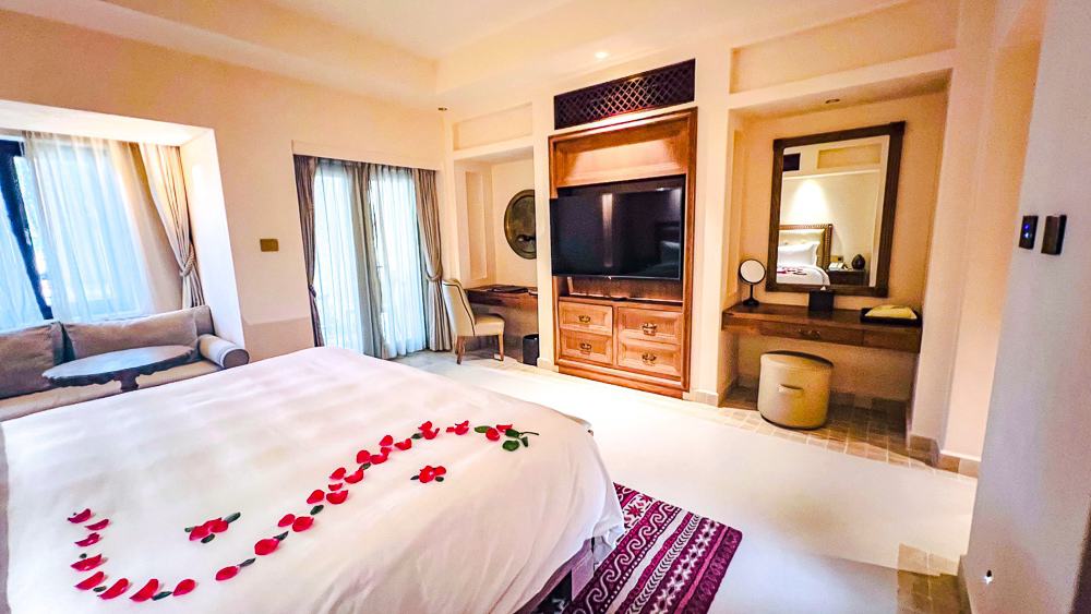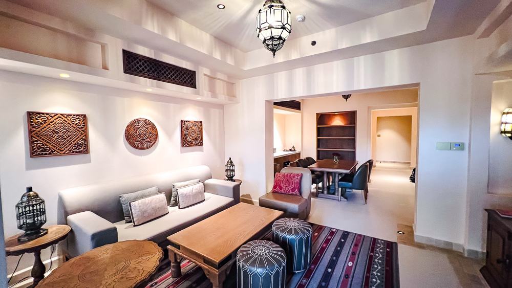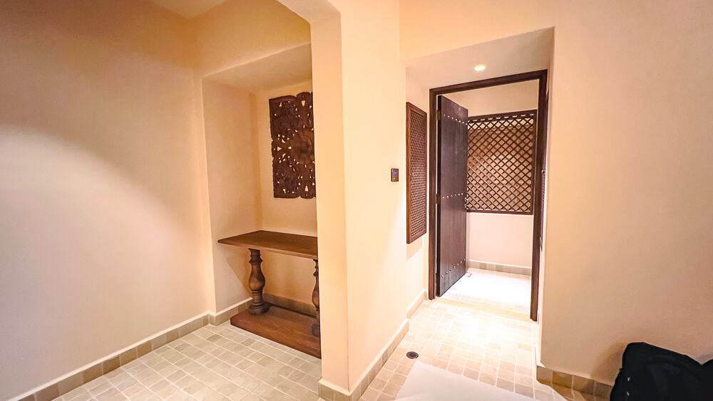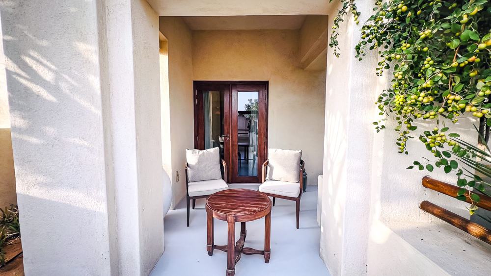 On traverse ensuite le complexe, qui rappelle les rues d’un village, accompagnés d’un maître d’hôtel pour nous rendre à notre suite située en rez-de-chaussée d’un des bâtiments à deux niveaux.