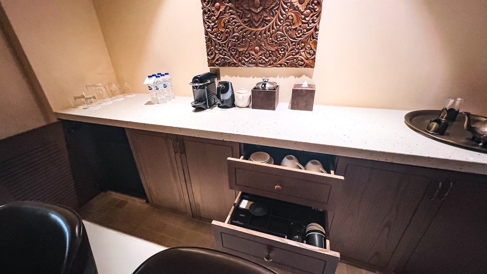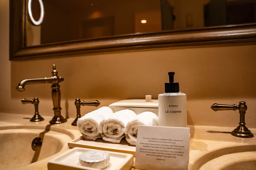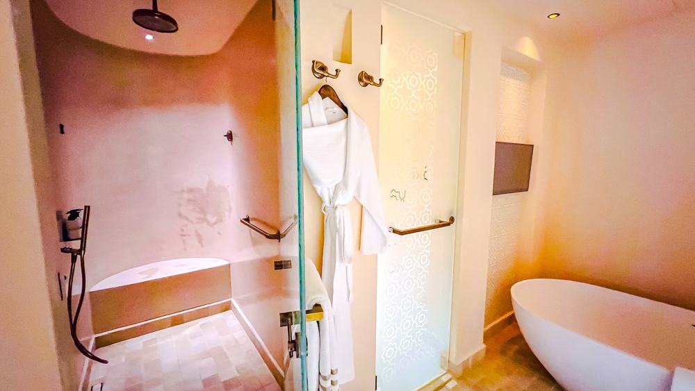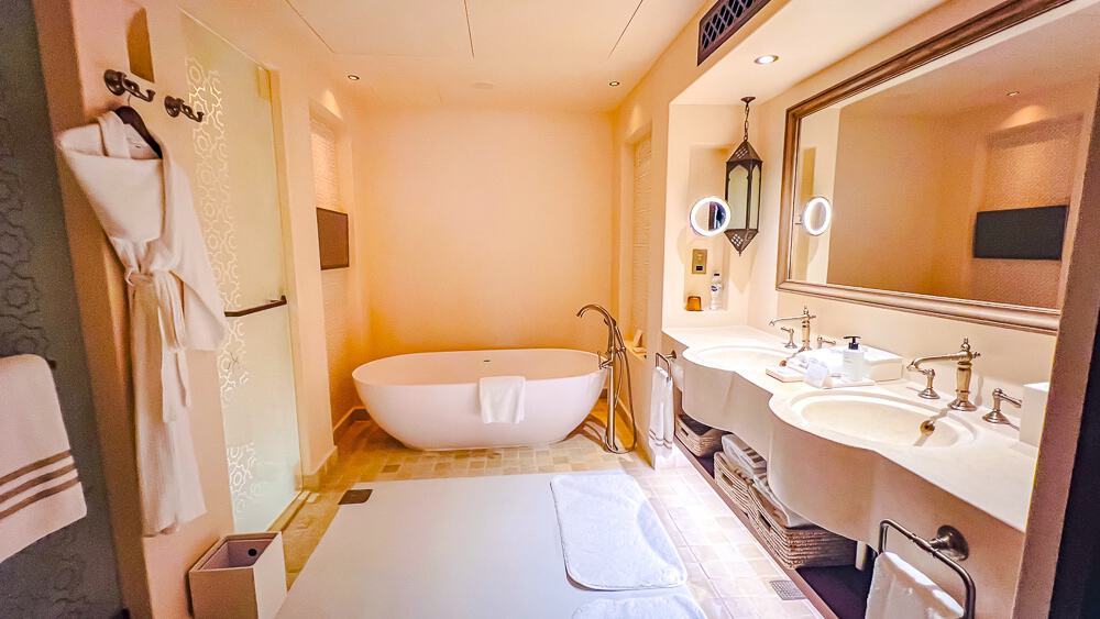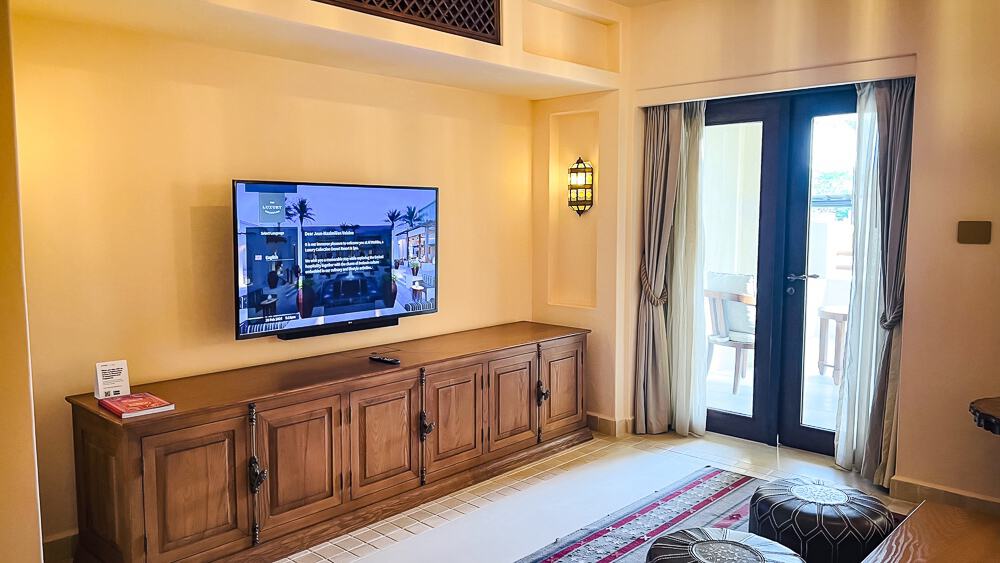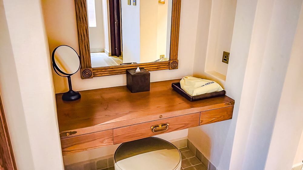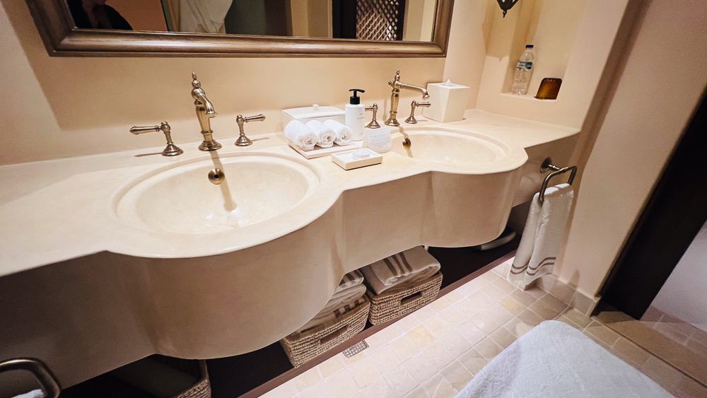 On traverse ensuite le complexe, qui rappelle les rues d’un village, accompagnés d’un maître d’hôtel pour nous rendre à notre suite située en rez-de-chaussée d’un des bâtiments à deux niveaux.
