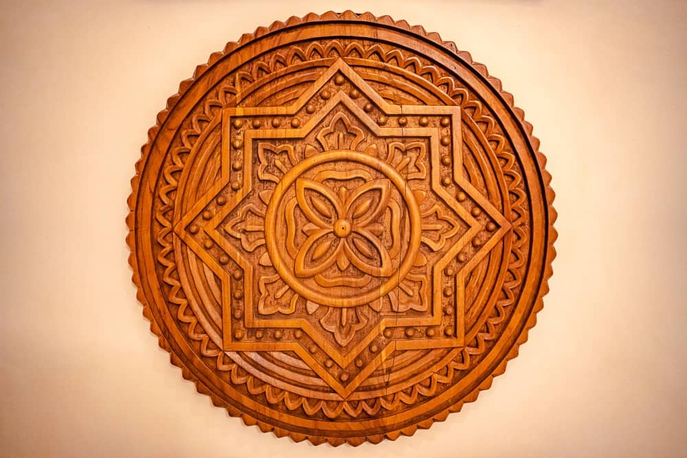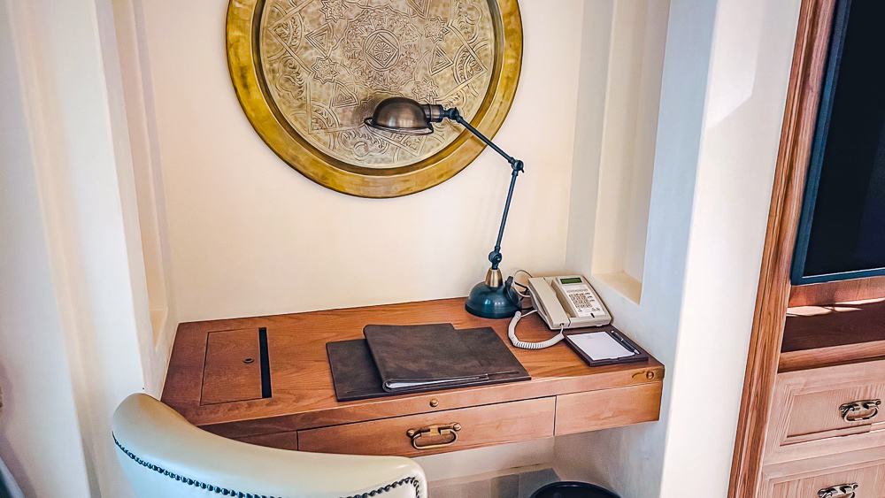 Une fois la grande porte extérieure passée, nous garons devant et entrons par une petite porte pour accéder à un petit hall d’accueil avec une fontaine en son centre, surplombée par un beau lustre arabe. Deux comptoirs sont présents: un pour s’enregistrer et l’autre pour les services de conciergerie.