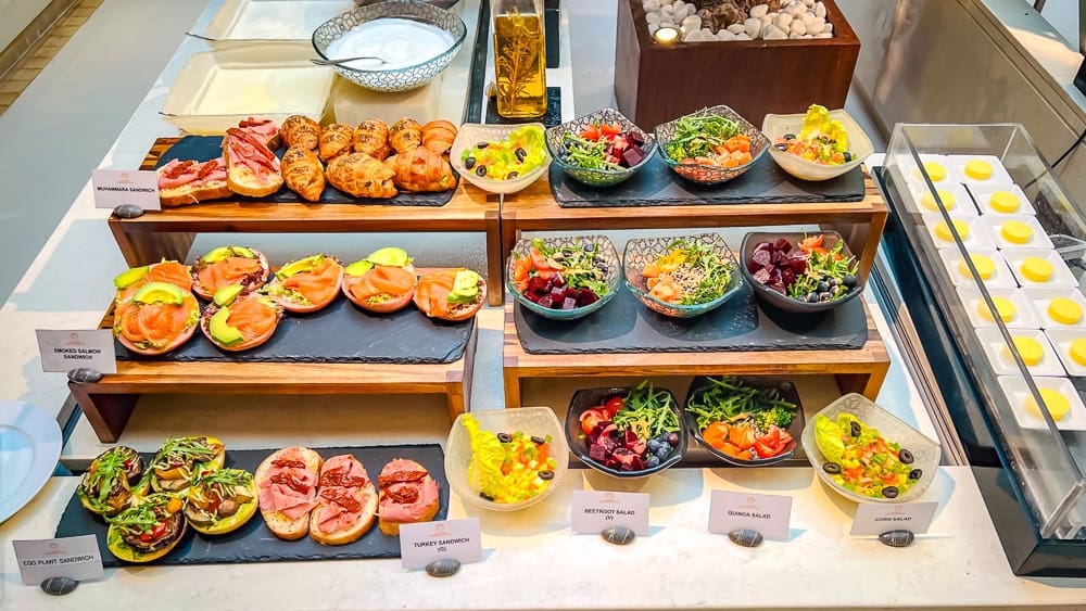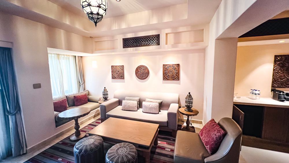 Un cocktail de bienvenue sans alcool nous sera offert à tous les quatre. Il en sera d’ailleurs de même à la piscine. Un petit buffet est mis à disposition des clients proposant des dattes et du thé arabe. Non loin de l’accueil se trouvent plusieurs jolis salons intérieurs qui se font suite ainsi qu’un salon business fermé.
