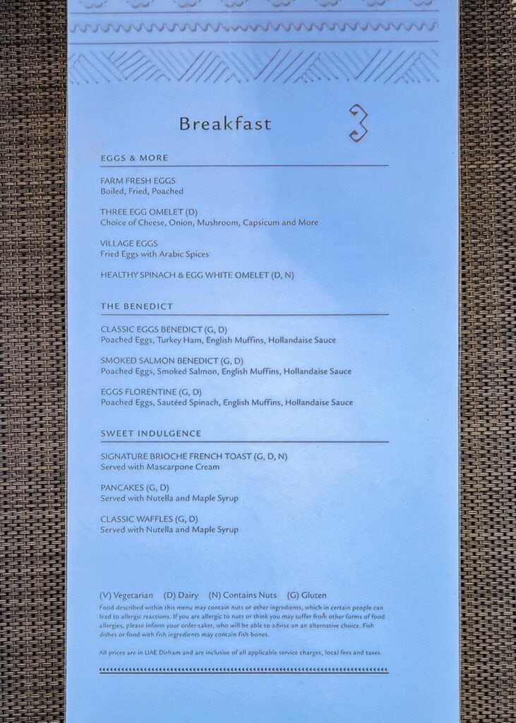 Le jour de notre départ, ayant un vol à 10 h 10 à Abu Dhabi et ne pouvant prendre le petit-déjeuner à l’hôtel, nous avions demandé la veille au soir si des boites repas pouvaient nous être préparées pour 6 h 30 mais rien n’était prêt le matin même.