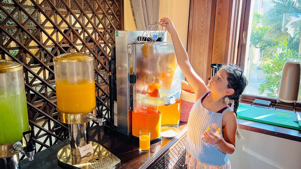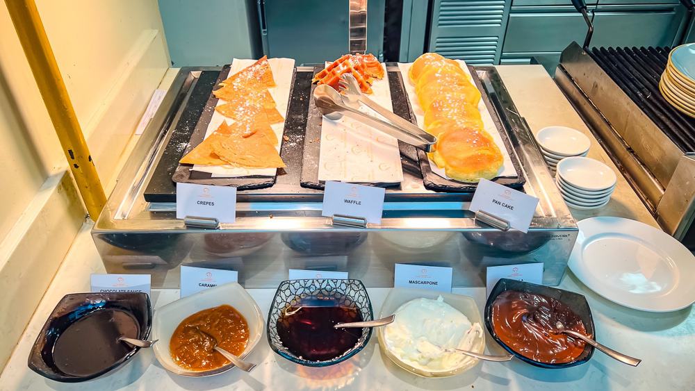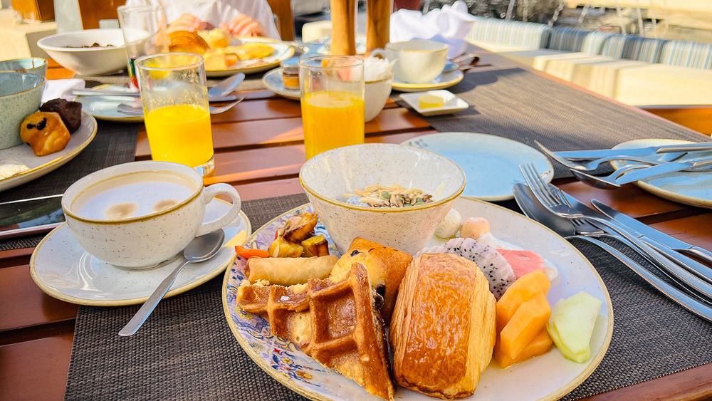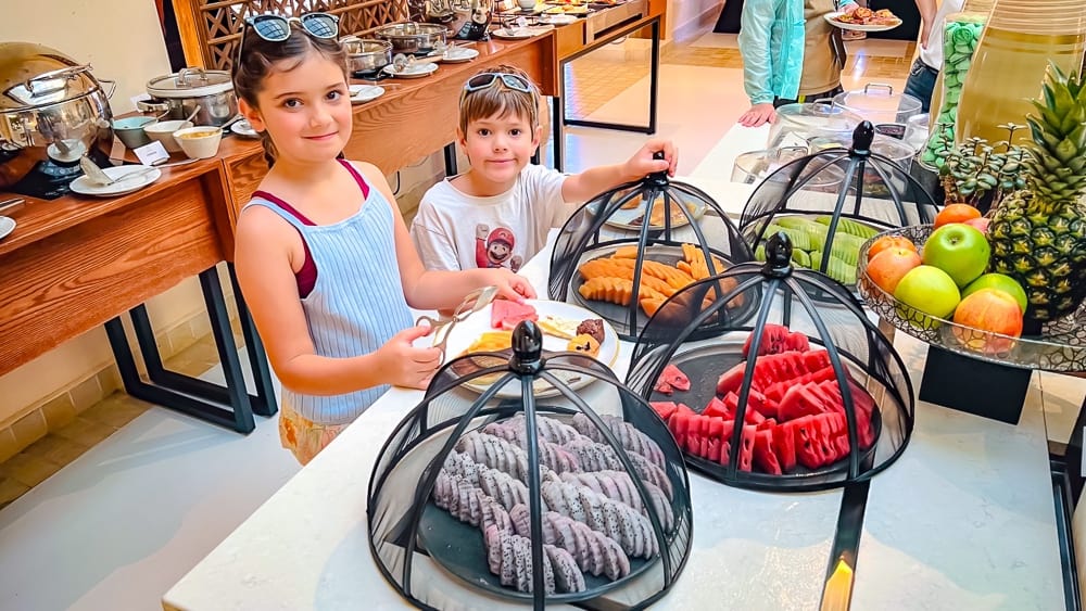 Le buffet est disposé en intérieur et protégé des mouches par des paniers. Les plats étaient bons et variés avec viennoiseries, gauffres, œufs bénédictines, fruits tropicaux, salades, plats chauds et bien d’autres. Les chefs ont souhaité offrir à nos enfants des pancakes en forme de Mickey, une jolie attention même si ceux avaient déjà des assiettes pleines.