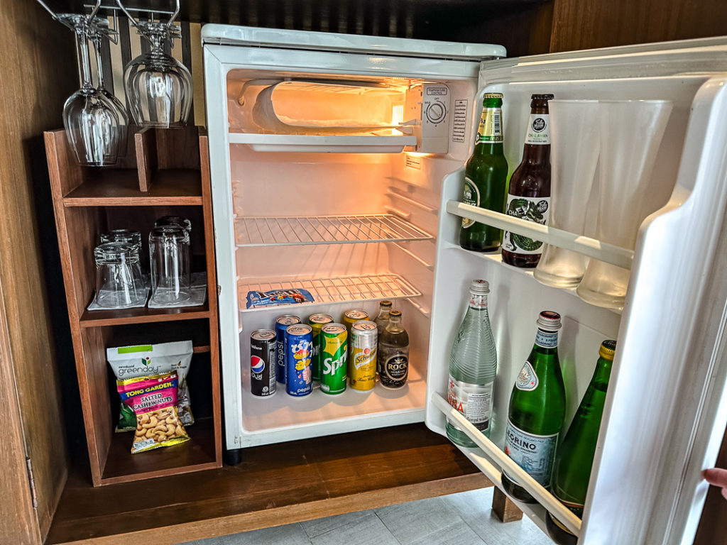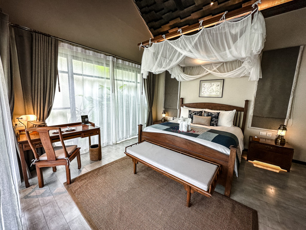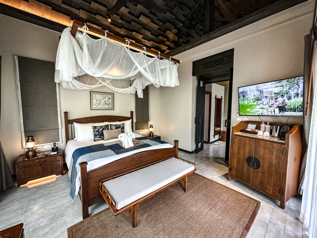 Lorsque l’on rentre dans la villa, on arrive directement dans la chambre avec son lit effet baldaquin orné d’une moustiquaire. Une télévision et un mini bar sont à disposition.