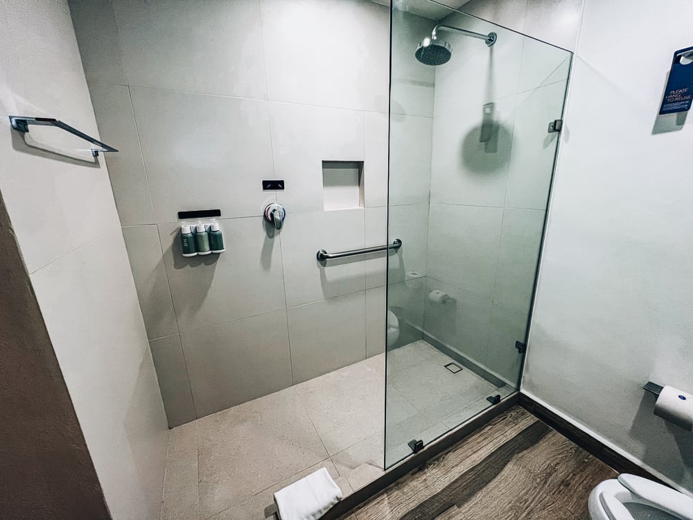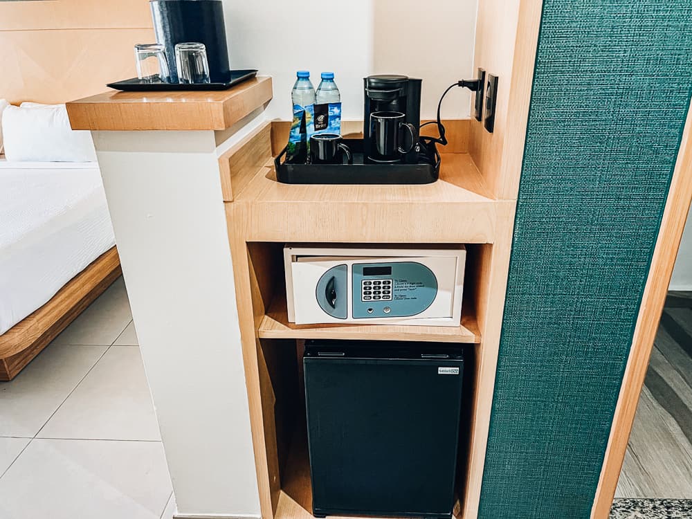 On retrouve aussi un miniréfrigérateur, un coffret de sûreté, une machine à café et des bouteilles d’eau. La salle de bain offre une douche de plain-pied avec les produits d’hygiène nécessaires et un séchoir à cheveux.