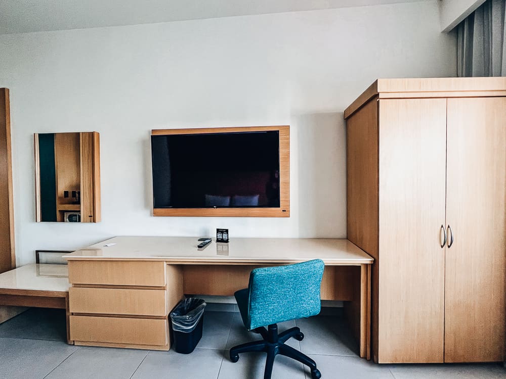 On m’a donné la chambre 340, fidèle à ma réservation et sans surclassement malgré mon statut Platinum, mais je n’en avais pas demandé non plus. La chambre est de taille moyenne et est meublée d’une banquette, d’un bureau avec chaise pour travailler, d’une grande télévision à écran plat et d’un grand placard.