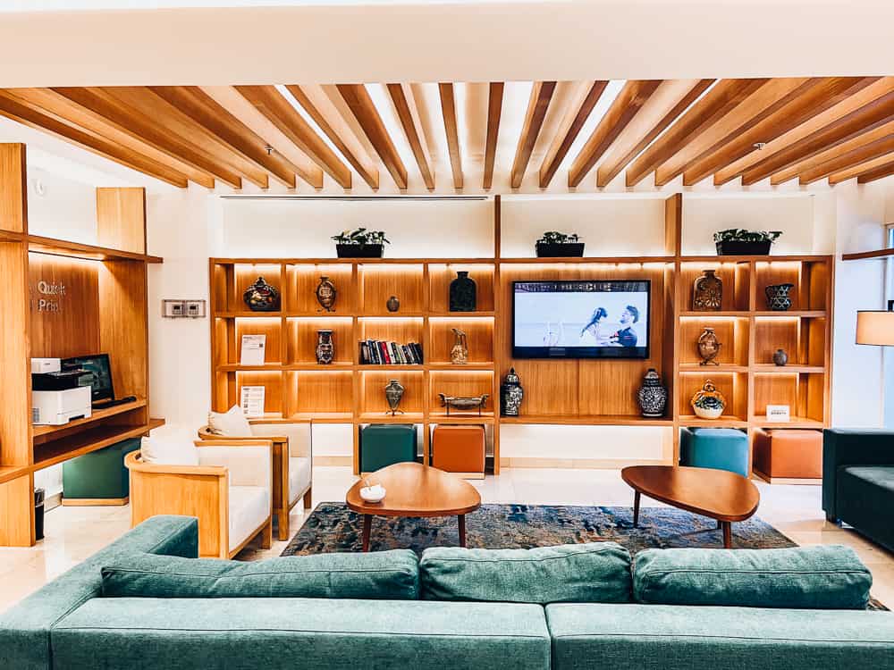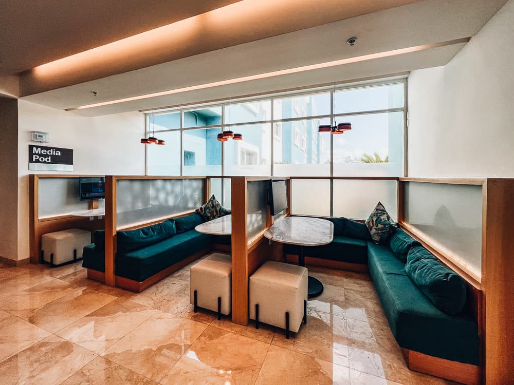 Les aires communes du hall d’entrée sont agréables au Courtyard Cancun Airport : coin salon, coin bar et coin média pour ceux qui doivent travailler.