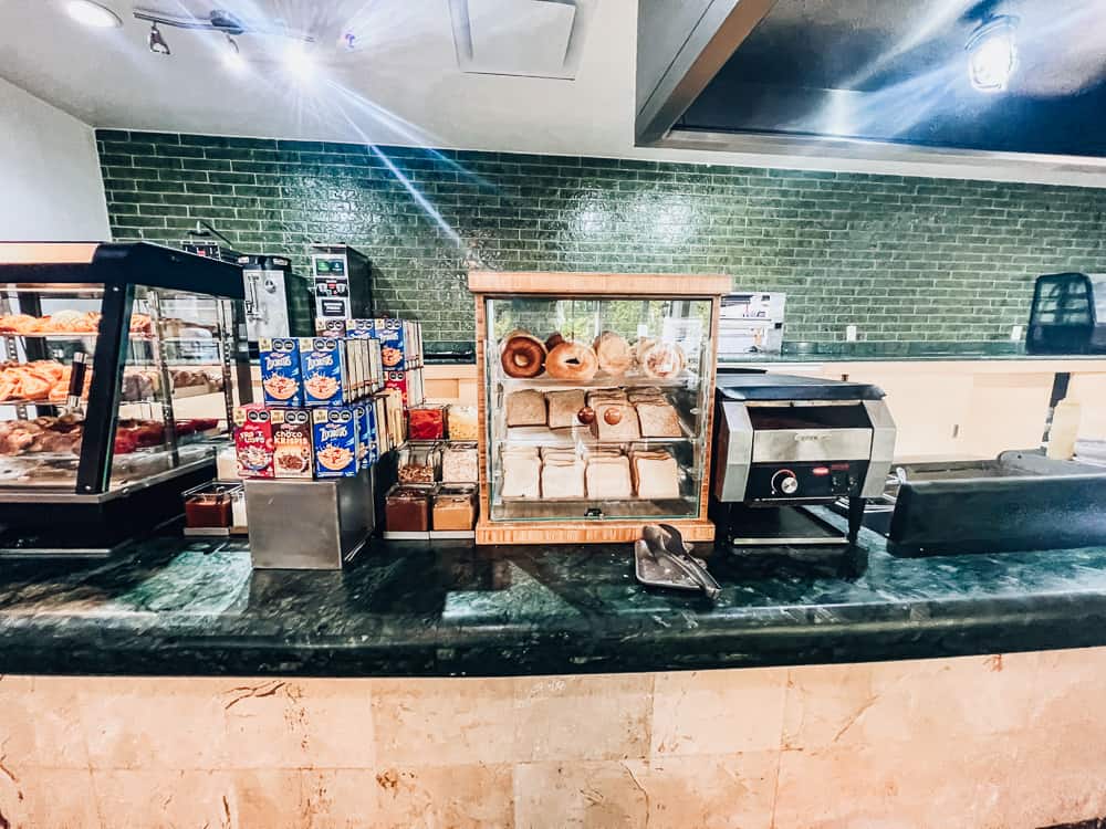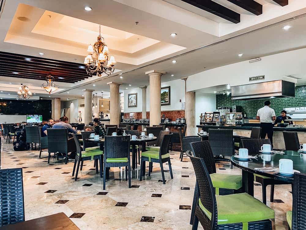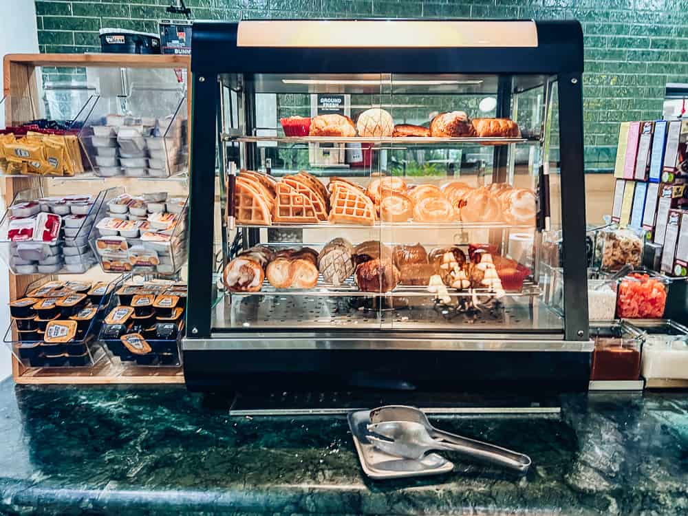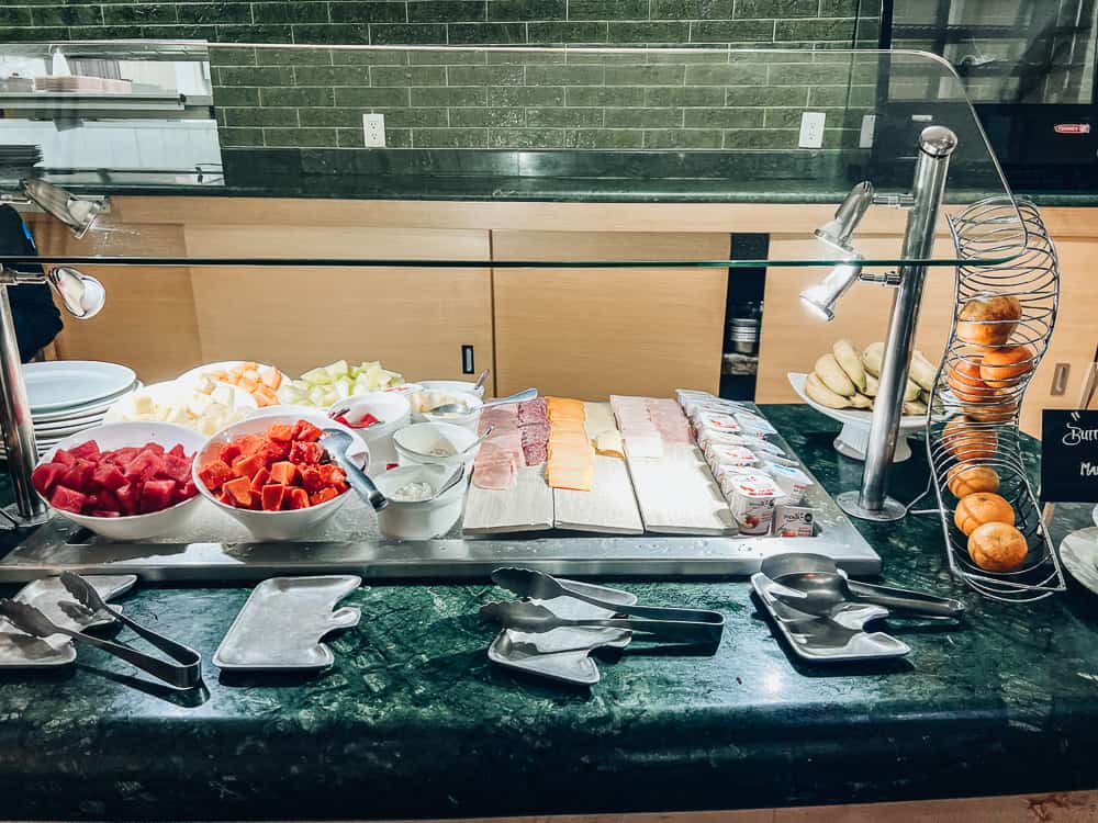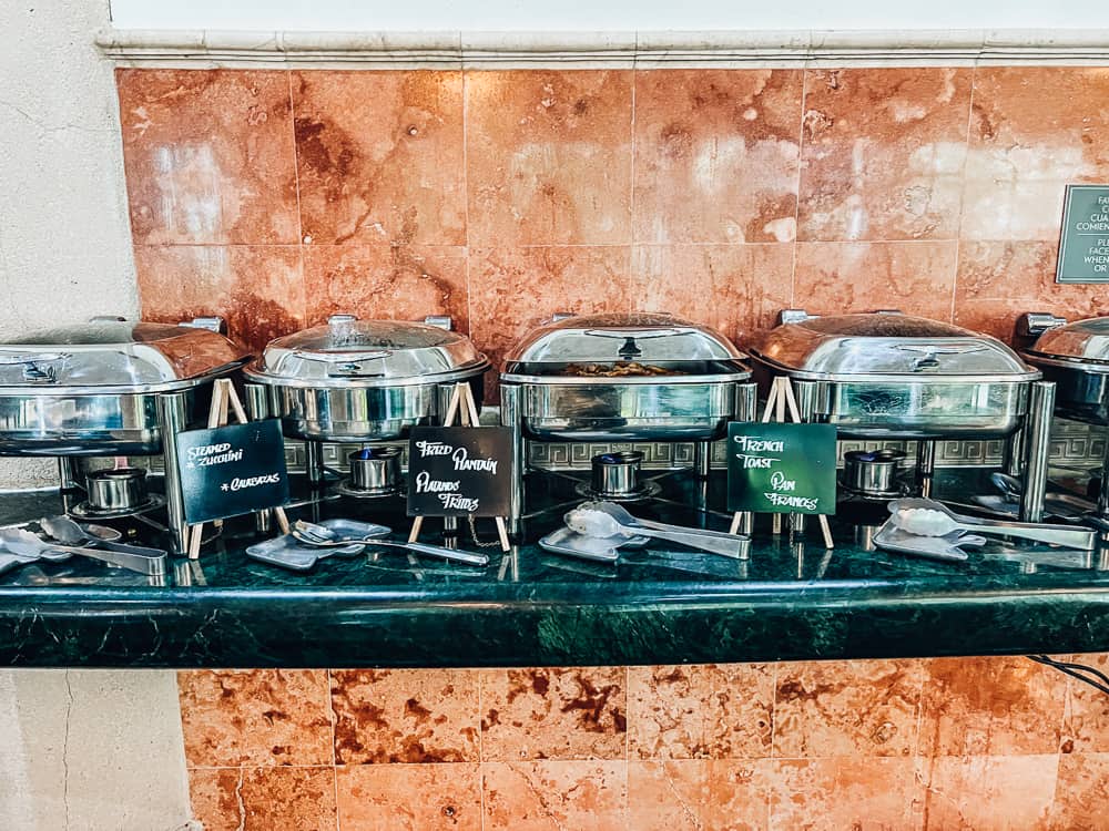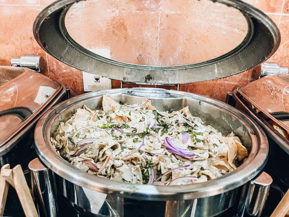 Dans le buffet froid on retrouvait tout l’essentiel : des fruits, du yogourt, des viandes froides et fromages, du pain, des viennoiseries et des gaufres avec sirops, beurre d’arachide, Nutella et confitures. Le buffet chaud offrait des légumes grillés, des saucisses, des chilaquiles (spécialité mexicaine), des pommes de terre, des frijoles, deux sortes de soupes et bien sûr, des sauces piquantes pour accompagner le tout.