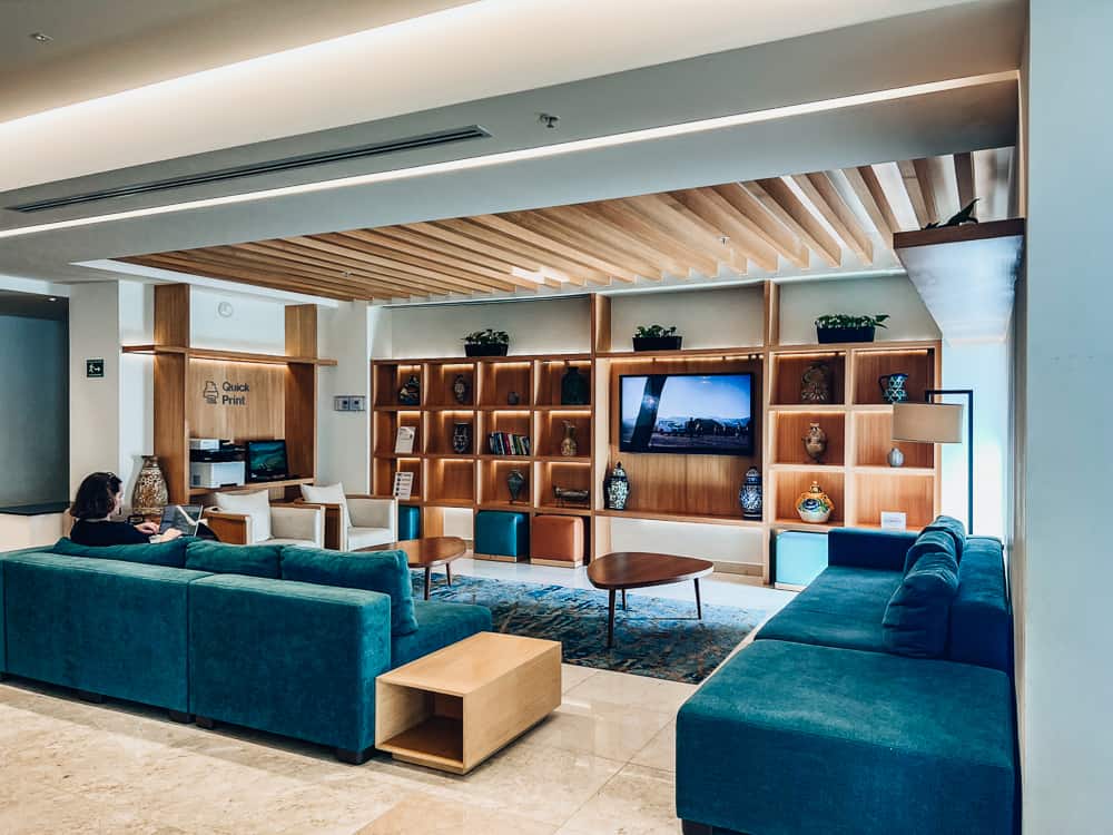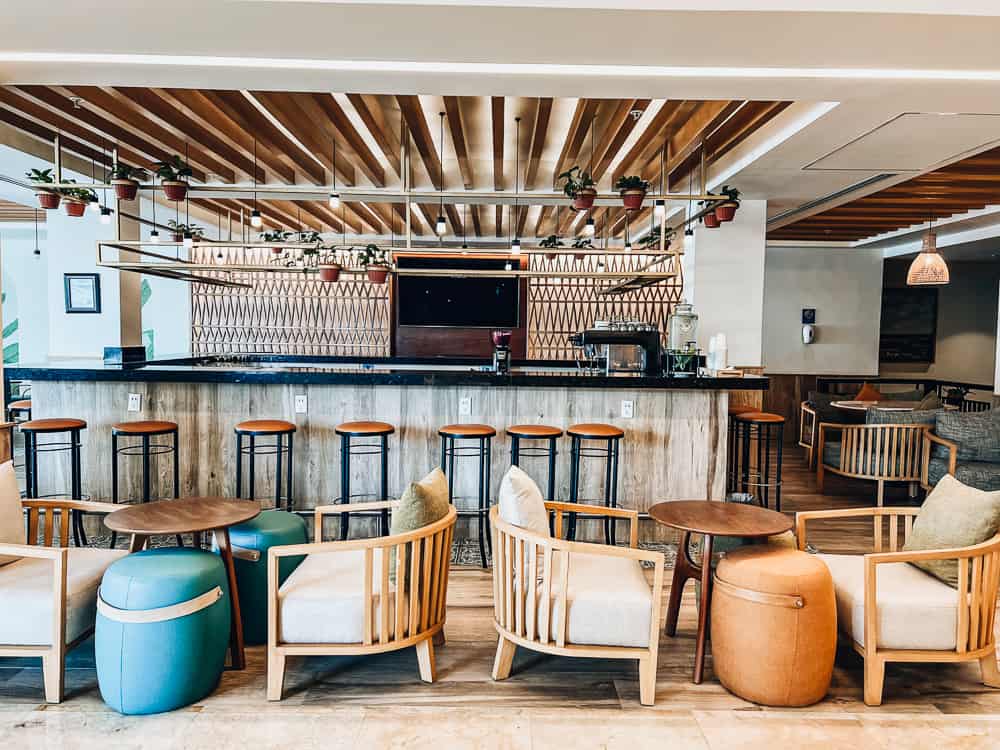 Le hall d’entrée du Courtyard Cancun Airport est très vaste et muni de nombreux espaces où se reposer, ainsi que d’un bar tout près de l’entrée.