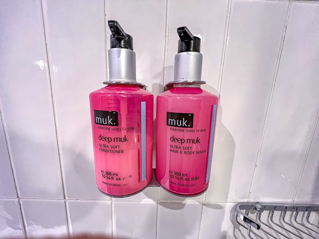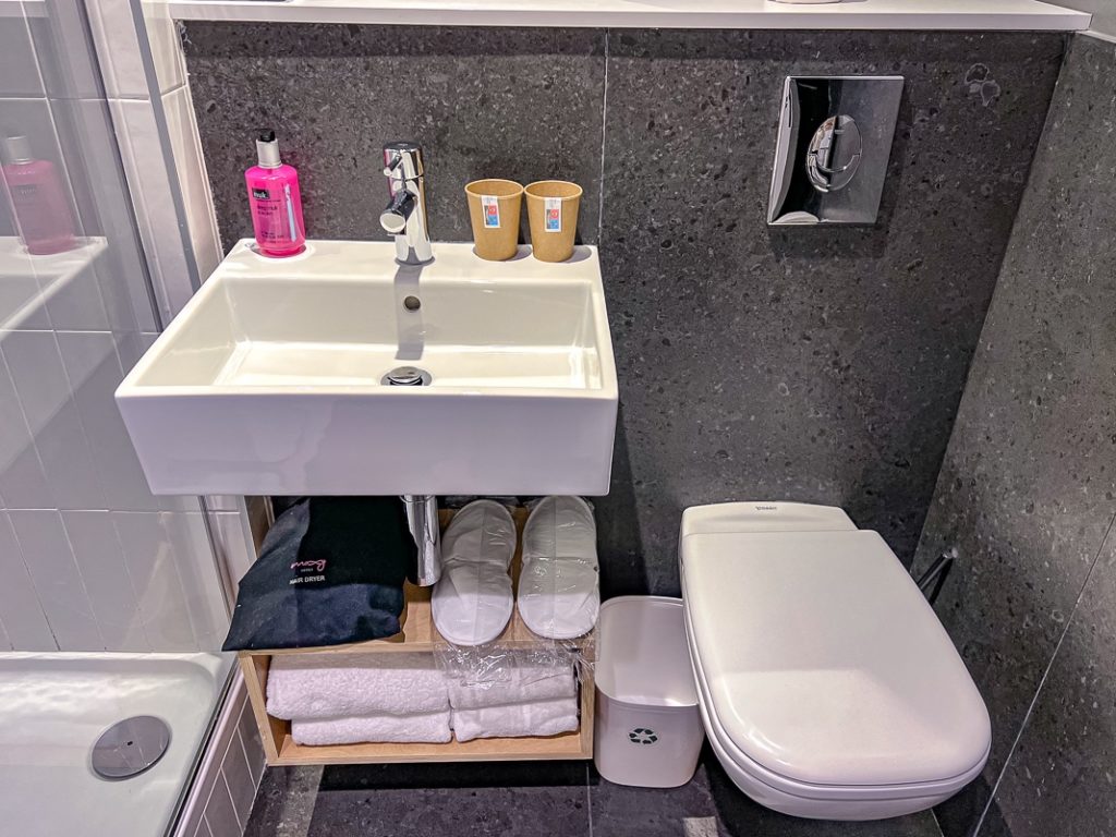 Elle était tout de même très bien aménagée pour maximiser l’espace, comme vous pouvez le voir. Dans la salle de bain, un séchoir et des pantoufles étaient fournis ainsi que des articles de toilette de la marque Musk.