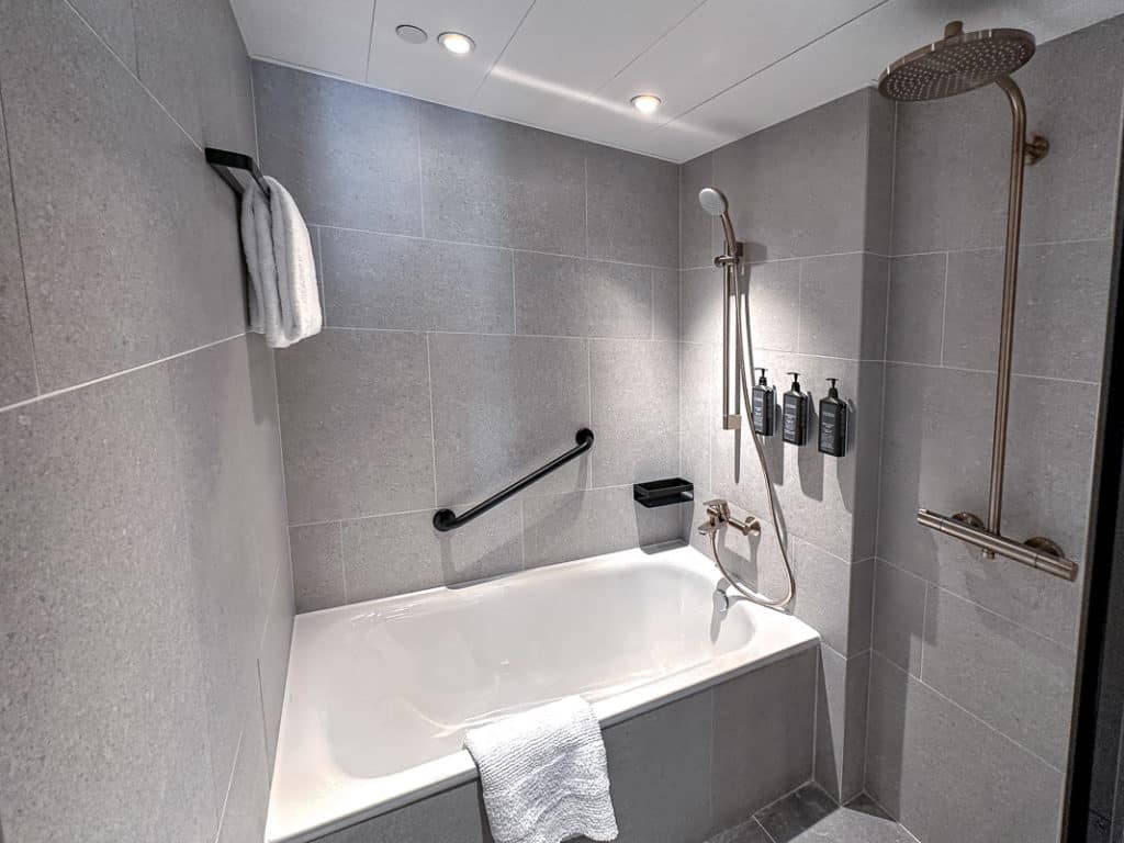 La salle de bain est un peu étroite, mais l’espace est bien optimisé. La douche et la baignoire sont ensemble dans une pièce vitrée, ce qui donne beaucoup de volume à la douche. Les finitions sont très belles. Pour tout vous dire, ça m’a donné le goût de refaire ma salle de bain !