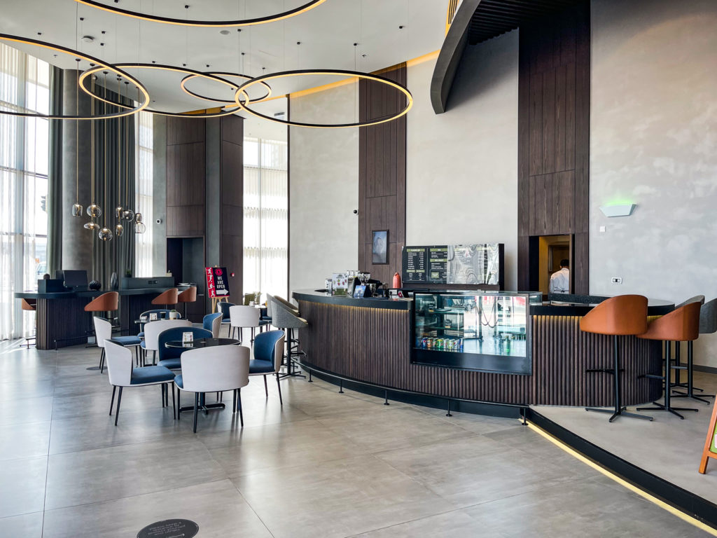 Le lobby de l’hôtel est très moderne avec un café-bar disponible. Les employés sont présents en nombre, mais ont tout de même encore besoin de formation pour être performants.