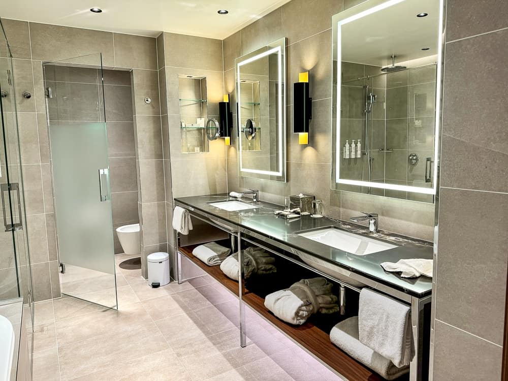 La salle de bain est spacieuse, équipée de deux vasques, d’une douche à l’italienne et d’une baignoire séparée.