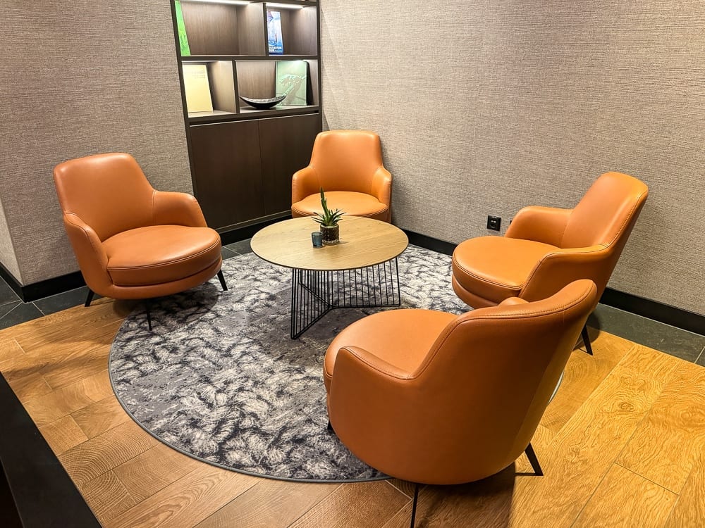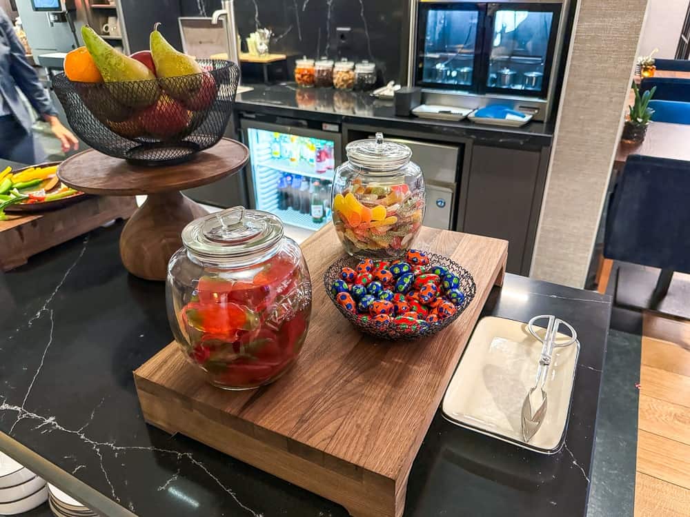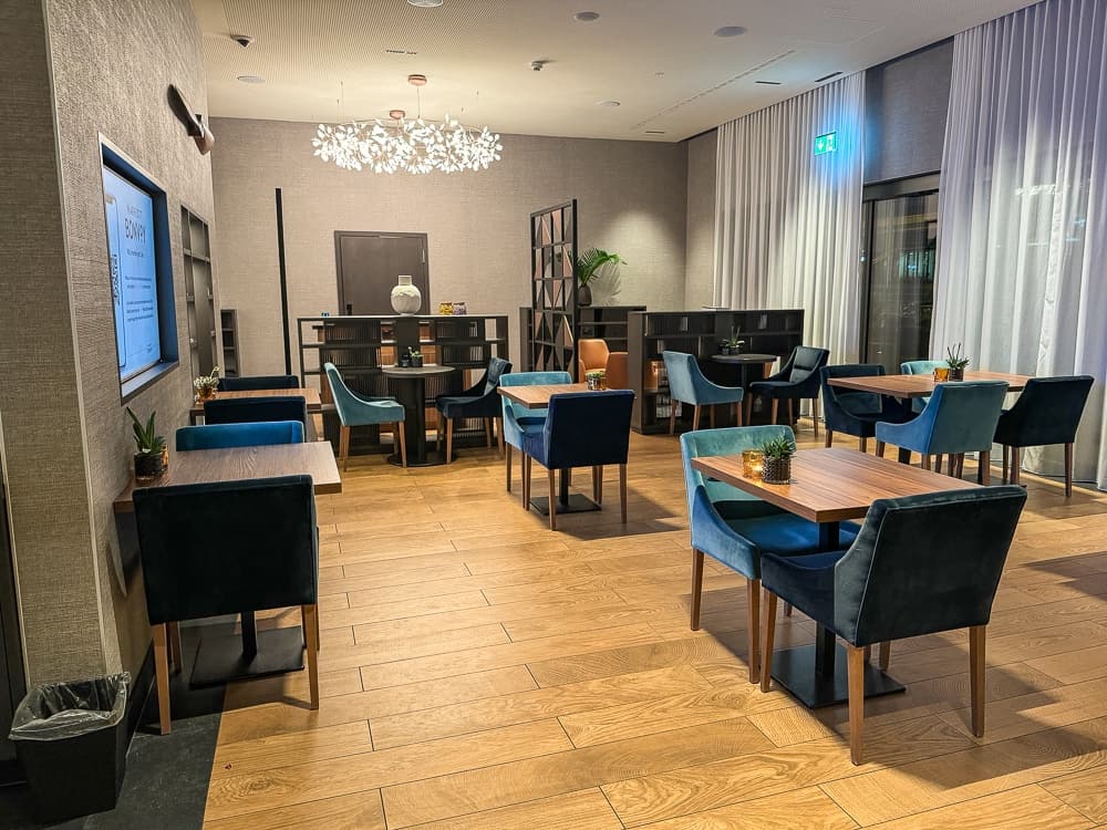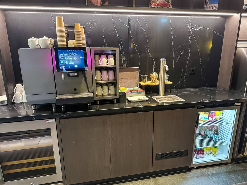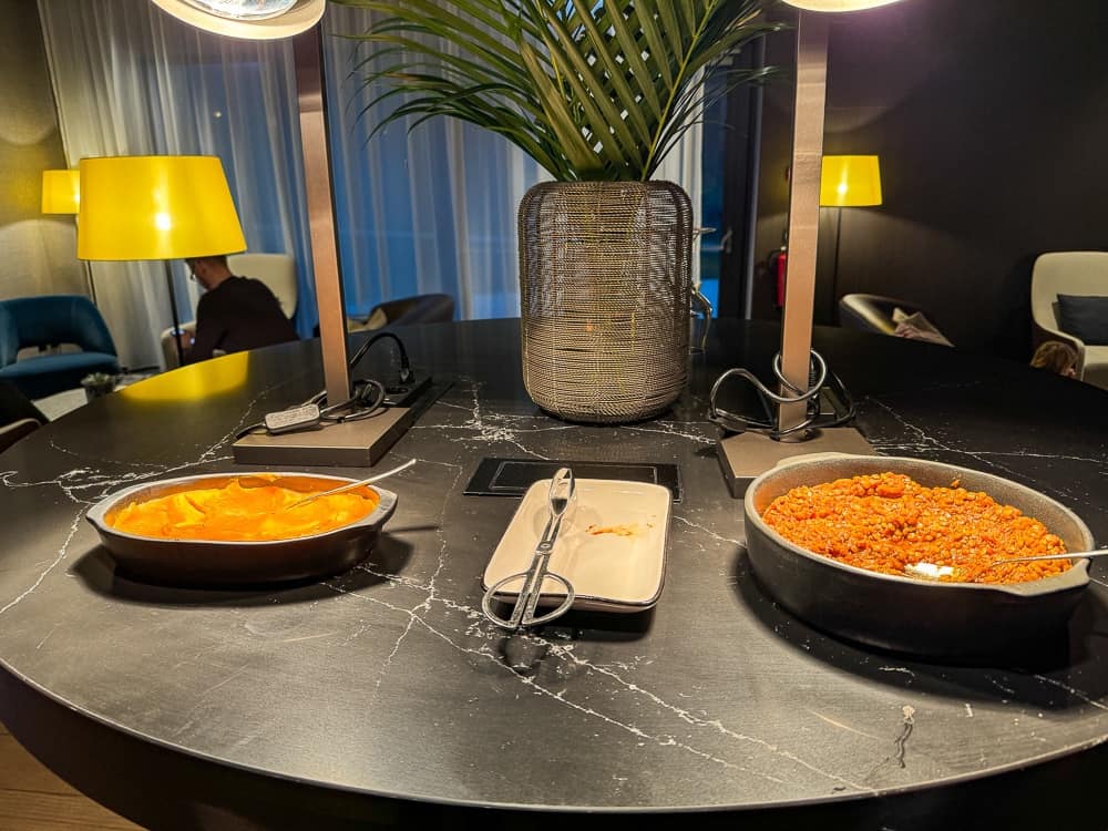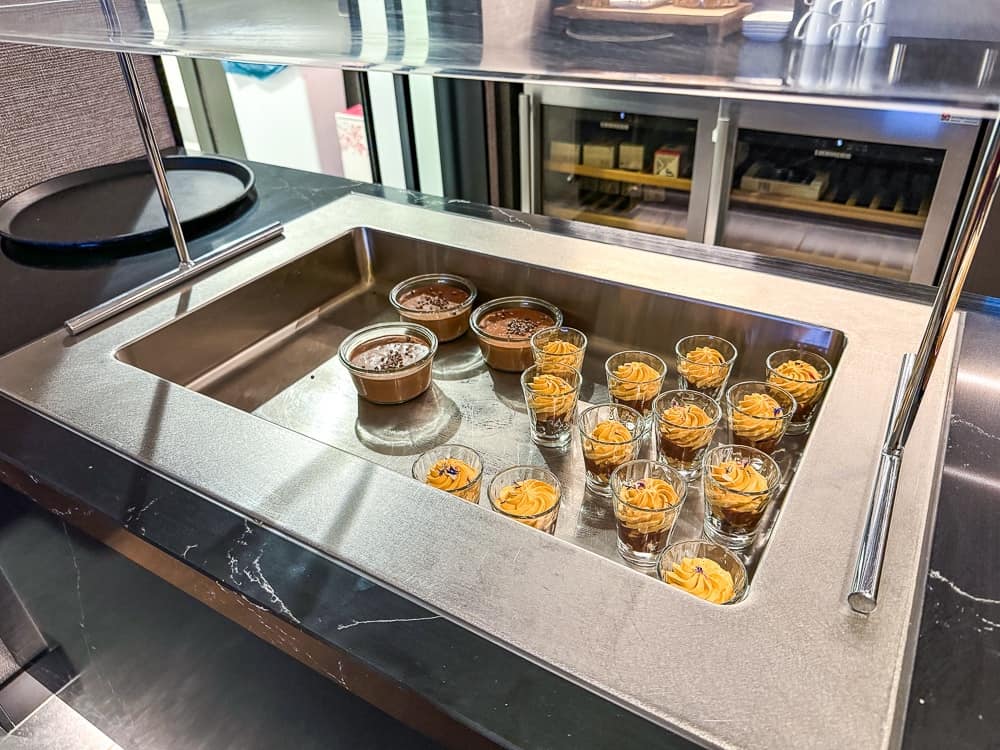 Le salon est ouvert 24h/24, il dispose d’une salle intérieure et d’un espace extérieur lorsque la météo le permet. Des en-cas sont offerts le midi et des hors-d’oeuvre (chauds et froids) ainsi que des desserts sont servis en fin de journée. Le reste du temps seulement des collations et des boissons sont disponibles. La sélection des plats était de qualité mais assez restreinte.