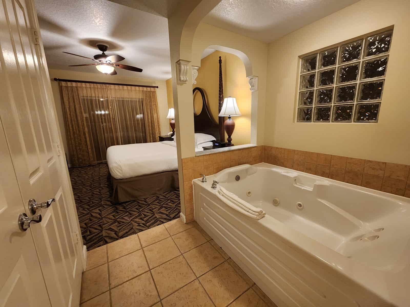 Il y avait une salle de bain avec une douche, deux lavabos et une énorme baignoire jacuzzi privative qui chevauchait la salle de bain et la chambre.