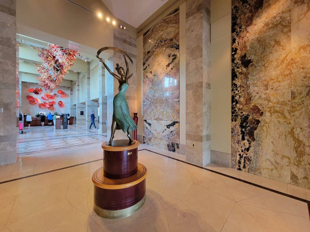 À son arrivée dans le hall d’entrée de l’hôtel, le visiteur est littéralement ébloui par les quatre lustres de verre soufflé créés par l’artiste Dale Chihuly ainsi que par les six îlots de fleurs rouges déployées sur le mur à l’arrière de la réception. De plus, un serpentin composé de petites œuvres de verre entoure la colonne du grand escalier menant à l’étage supérieur de l’hôtel. Tout comme le même artiste l’a fait à l’hôtel Bellagio de Las Vegas, le résultat est saisissant!