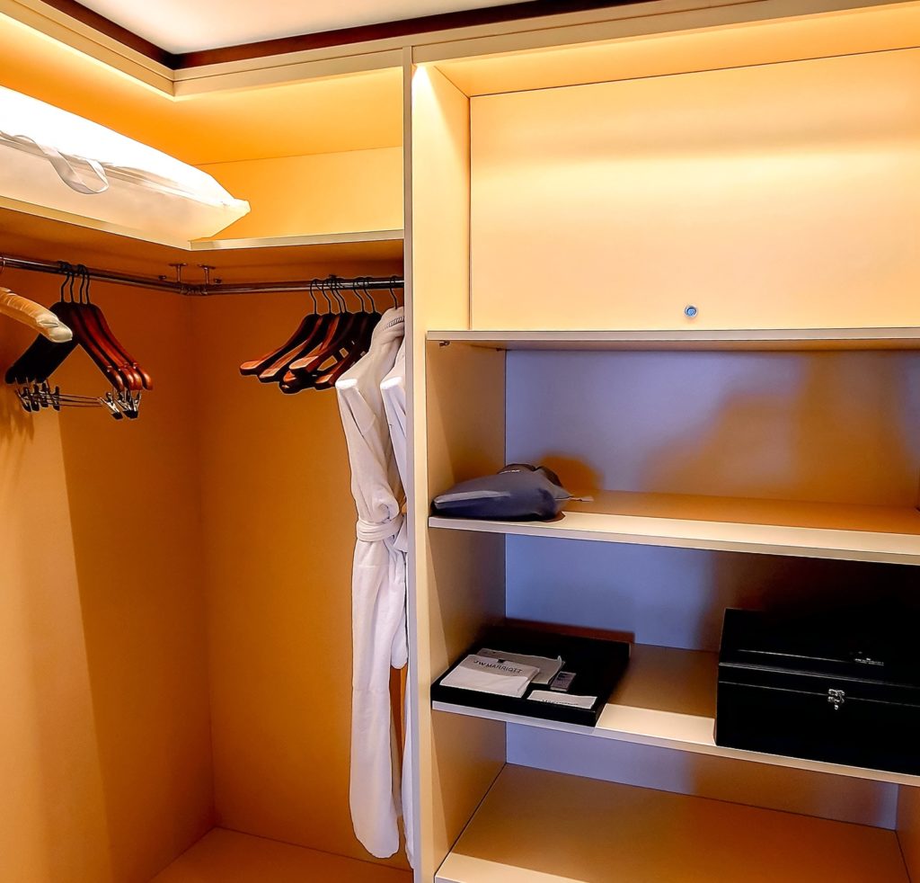 Dans le passage qui mène à la salle de bain, on retrouve un petit bureau de travail avec téléphone, prise électrique et USB. Un endroit assez étonnant pour y installer un espace de travail. Tout au fond, une immense garde-robe, avec deux robes de chambre, des espaces de rangement et un coffre-fort.