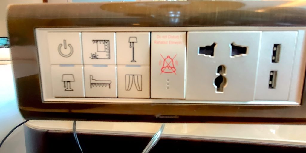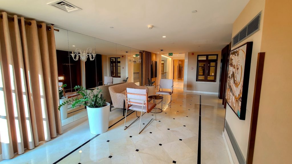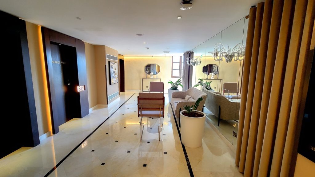 La suite Premier avec vue sur le Bosphore “Beylerbeyi Palace” est située au 6e étage – porte 617 – et on s’y rend via un passage fenestré qui donne sur l’atrium. Sur l’étage, ils ont installé un petit salon (sofa, chaises et table), ce qui en fait un espace idéal pour une petite pause.