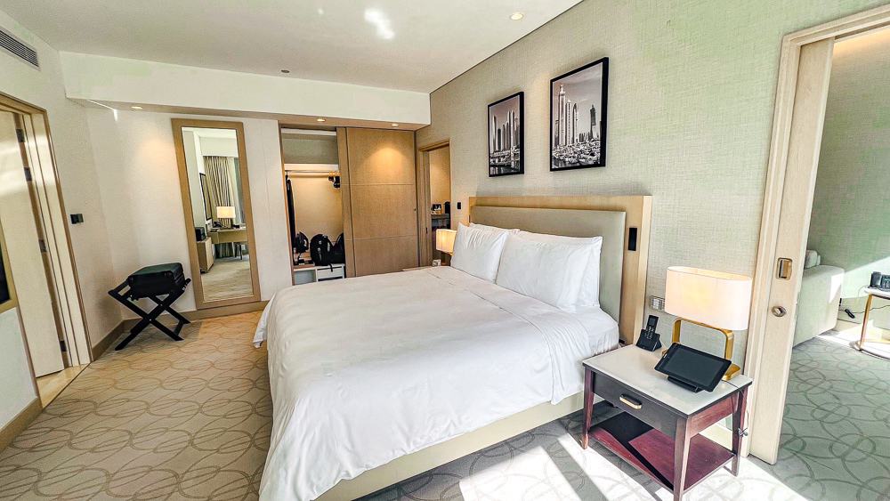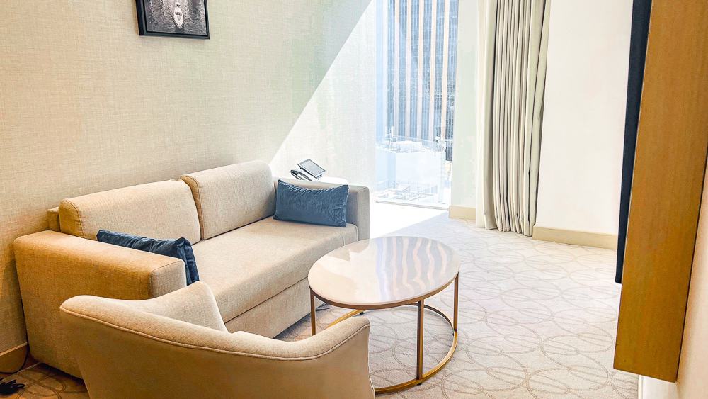 À notre entrée dans la suite en après-midi, celle-ci était baignée de lumière, ce qui était très agréable. La décoration est moderne avec son mobilier au teintes claires, le tout est plutôt confortable et de bonne grandeur comme en témoigne les photos.
