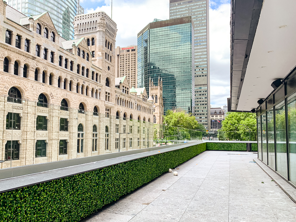 L’immeuble à l’Est de l’hôtel est le 1 000 de la Gauchetière, qui abrite des bureaux et des commerces, mais aussi une patinoire intérieure ouverte toute l’année.
