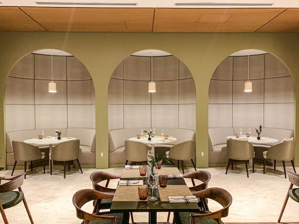 Dans le logo du restaurant, on remarque le clin d’oeil aux lignes verticales du bâtiment. Puis, dans le nom, il y a le rappel des fenêtres en demi-lune. Chaque détail a été bien pensé.