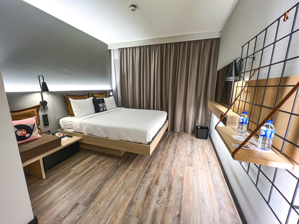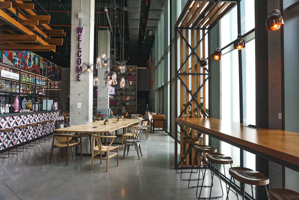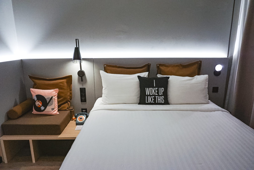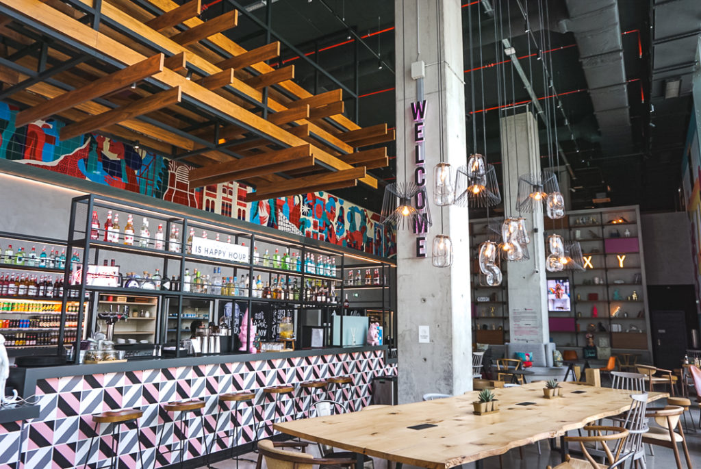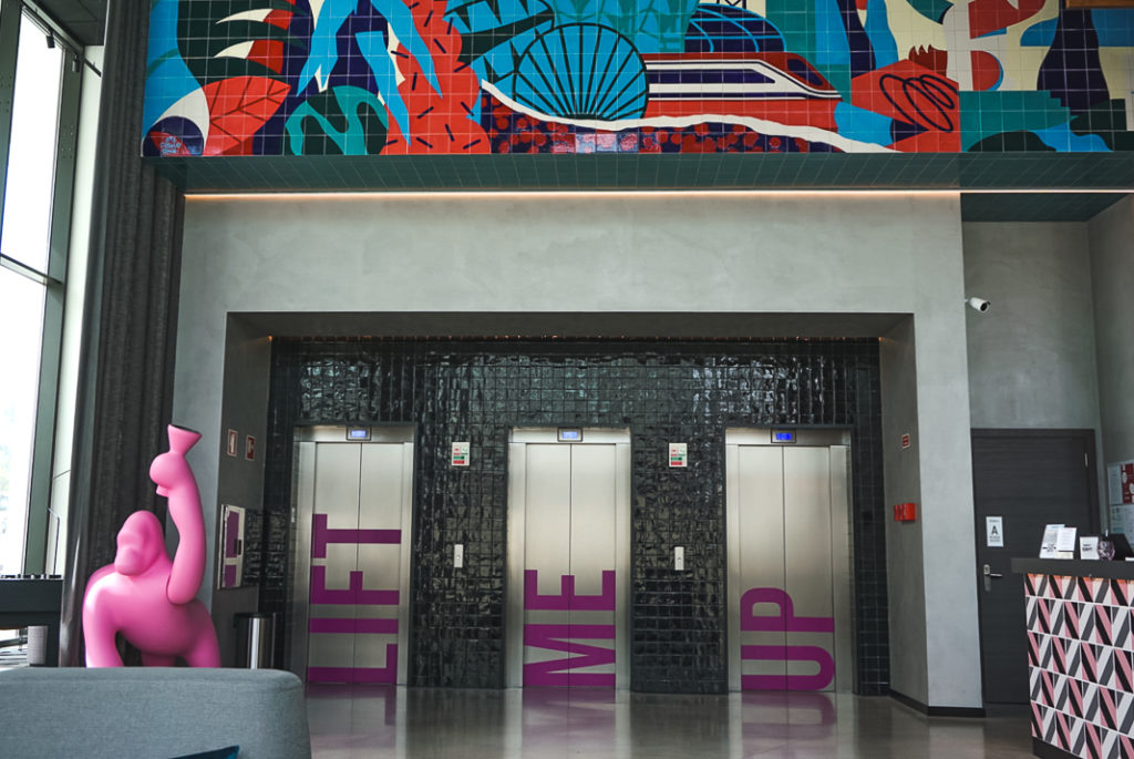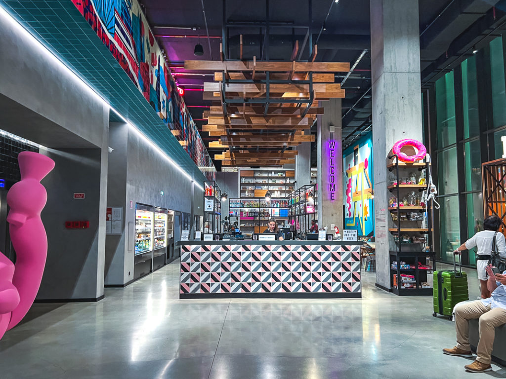 Les hôtels Moxy ciblent surtout les jeunes voyageurs et professionnels, son décor est assez urbain et suit les tendances de ce qui est « Instagrammable ». On le remarque tout de suite lorsqu’on franchit la porte.