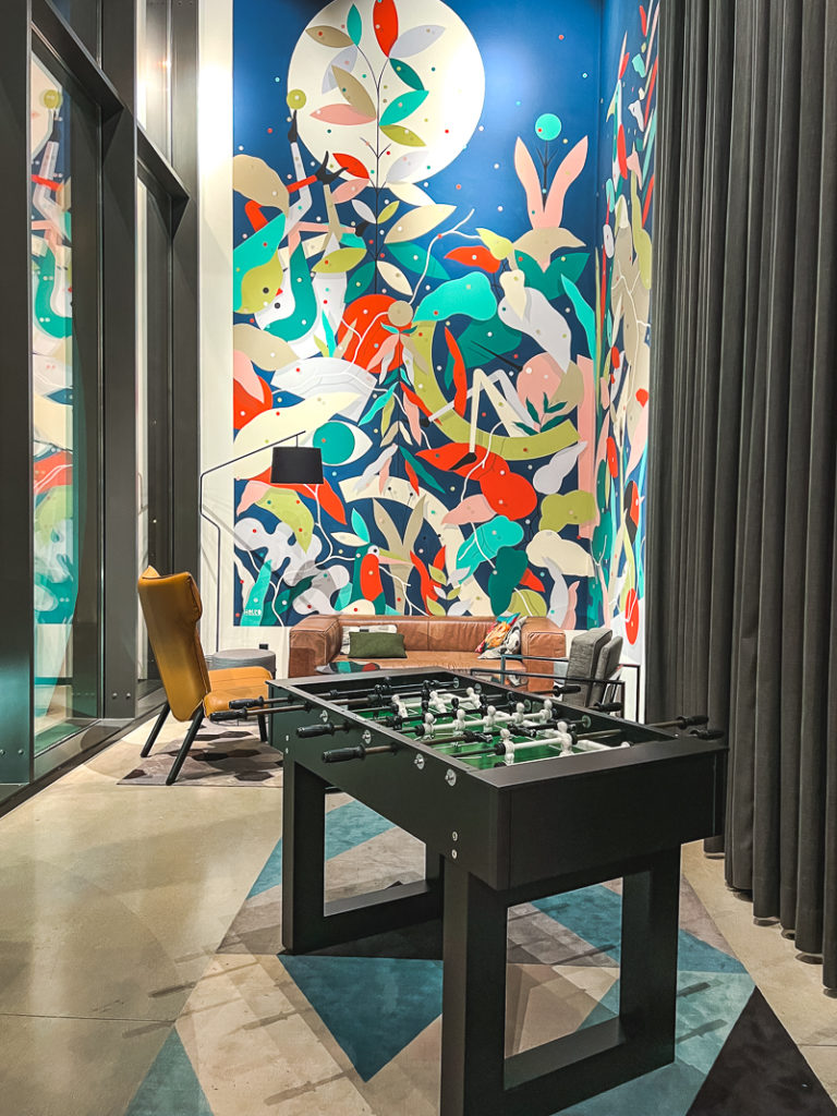 Ce que j’apprécie beaucoup de Moxy, c’est son aire commune invitante. Après une longue journée de visite, on peut s’installer au bar, jouer une partie de babyfoot ou simplement prendre un moment pour relaxer.