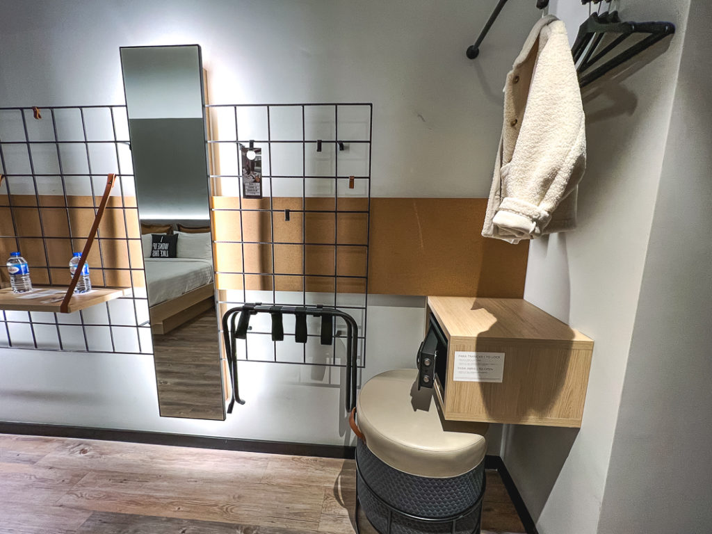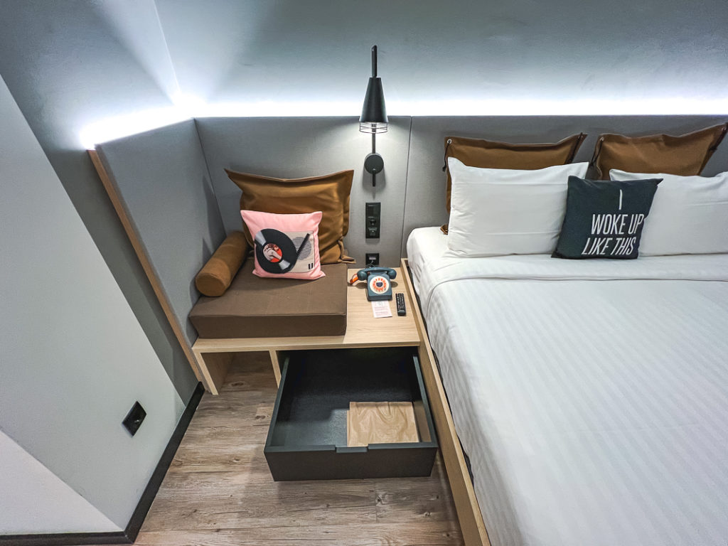 L’espace a cependant été bien pensé pour ne pas se sentir trop à l’étroit, avec un tiroir pouvant être glissé sous le lit pour les bagages et une mini banquette pouvant servir de coin lecture.