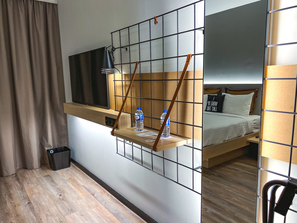 On y retrouve aussi une télévision HD à écran plat, deux petites bouteilles d’eau, un coffre-fort et du rangement mural. La fenêtre avec vue sur la station Oriente est assez petite. La chambre est plutôt conçue pour s’y reposer le soir que pour y passer la journée.