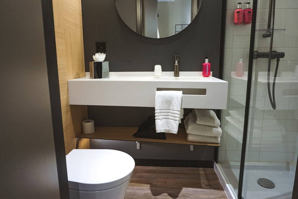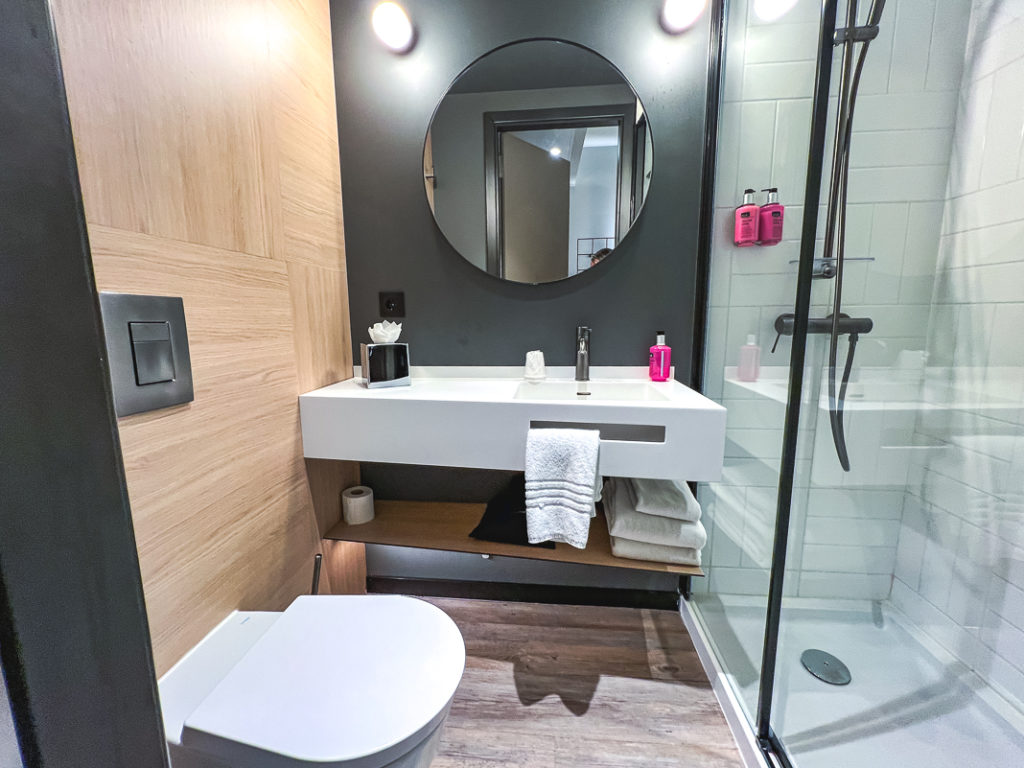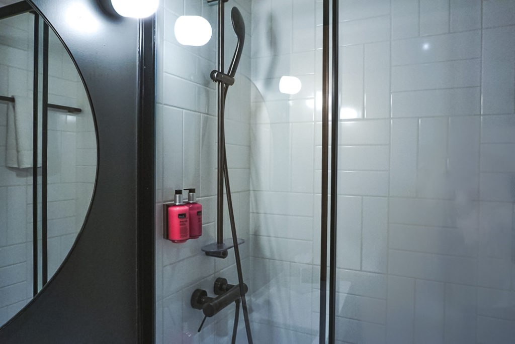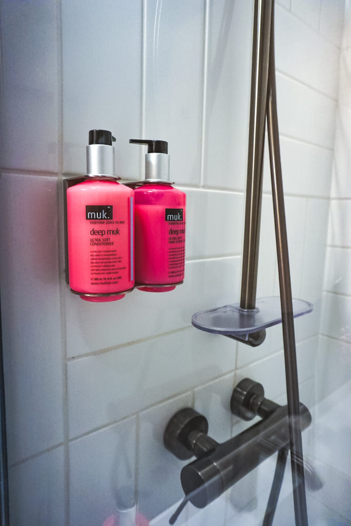 La salle de bain est munie d’une douche à l’italienne et de produits de toilette MUK en grand format, une option plus écologique que les petites bouteilles habituelles.
