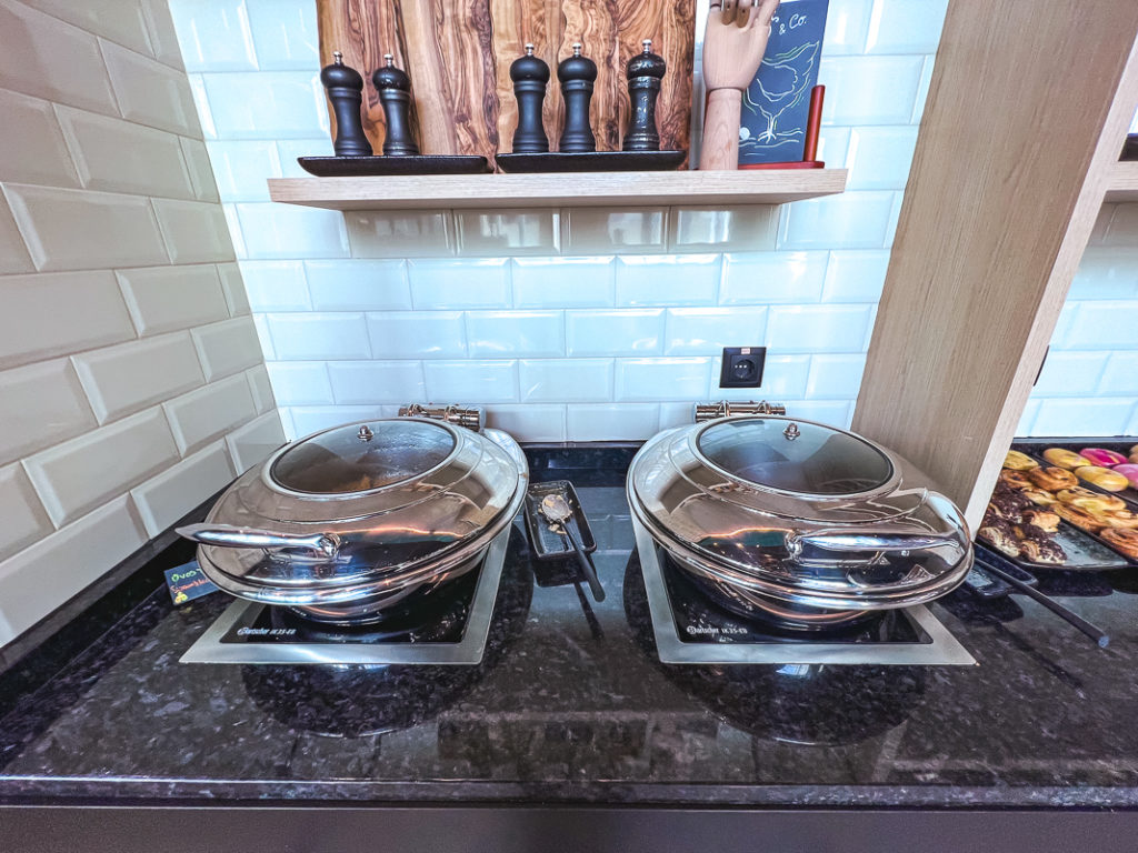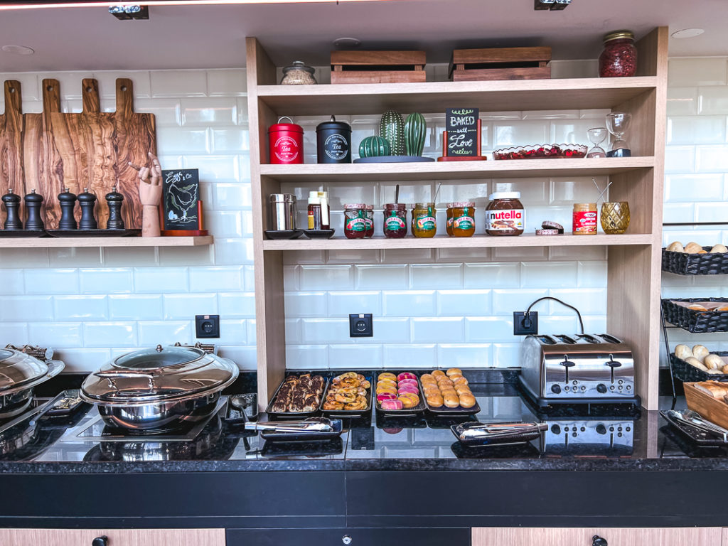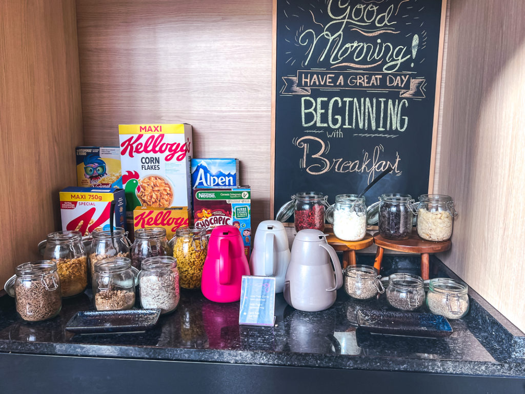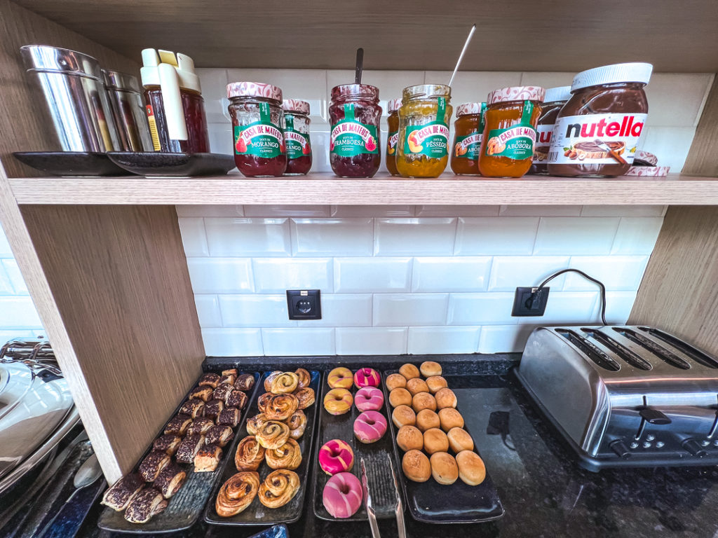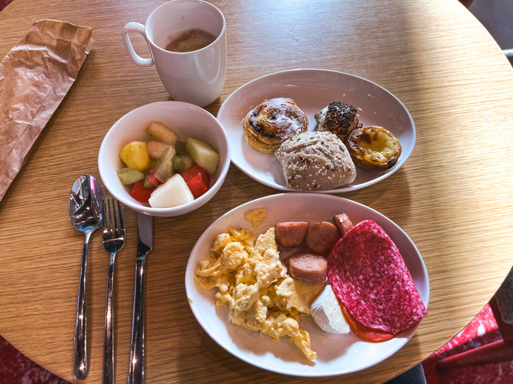 Pour 10 euros, un prix très raisonnable, j’ai pu profiter du buffet de petit-déjeuner. Il était assez complet, avec un buffet chaud et froid incluant tous les essentiels : céréales, œufs, fruits, viandes froides et fromages, viennoiseries, café, thés et jus, et même des pastels de nata, la spécialité typique du Portugal. J’ai trouvé que le rapport qualité/prix en valait la peine.