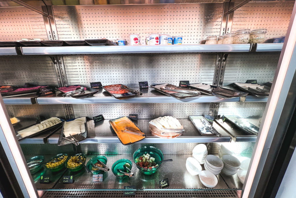 La réception est intégrée au même espace que le bar et on y trouve un petit comptoir avec de la nourriture, du vin et des bouteilles d’eau pour dépanner.