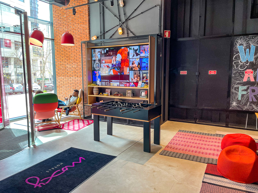 Face à la réception, se trouve un baby-foot et une table de travail commune (avec là-aussi de multiples branchements). Cela fait un peu penser à une auberge de jeunesse haut de gamme.